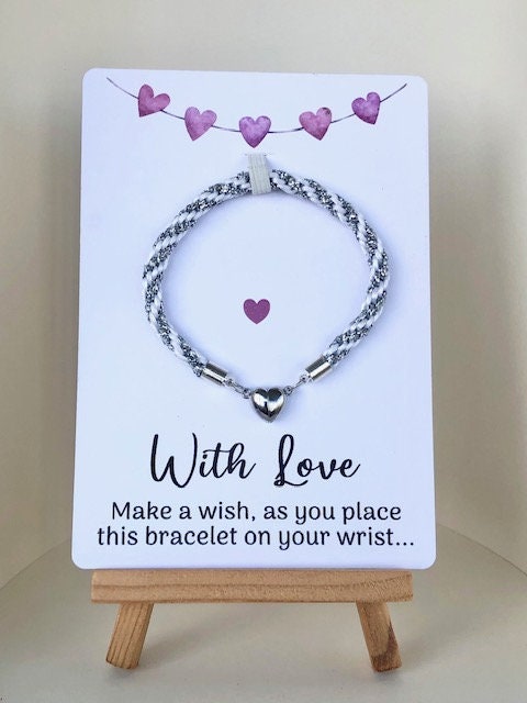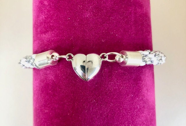 This handmade kumihimo friendship bracelet is 7 inches long and is made using 4 strands of 1.5mm satin cord and 4 strands of shiny silver cord. The bracelet fastens with a silver coloured magnet heart clasp.