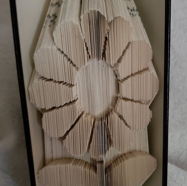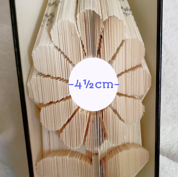 This listing is for a book folding pattern that enables you to create a book with the design pictured. Small space for photo is approx. 4-4.5 cm across depending on how wide your book is opened. A free written tutorial is included to guide you through the folding process.