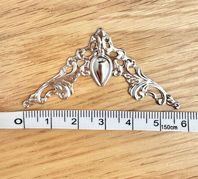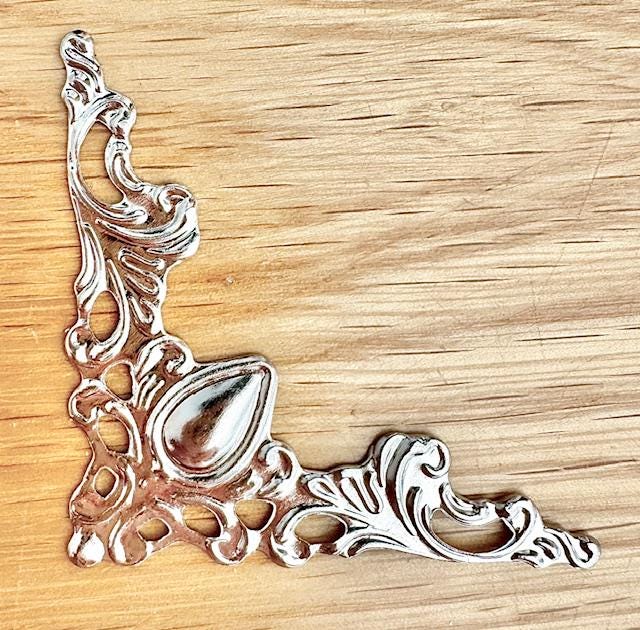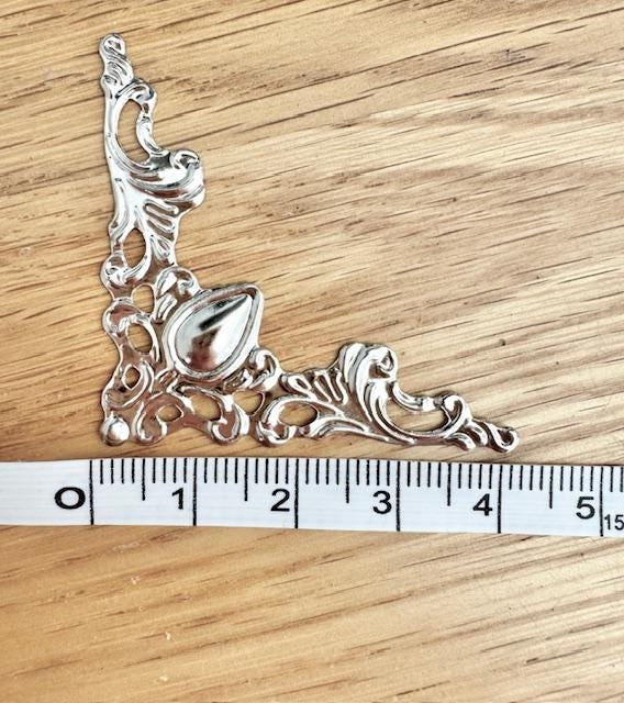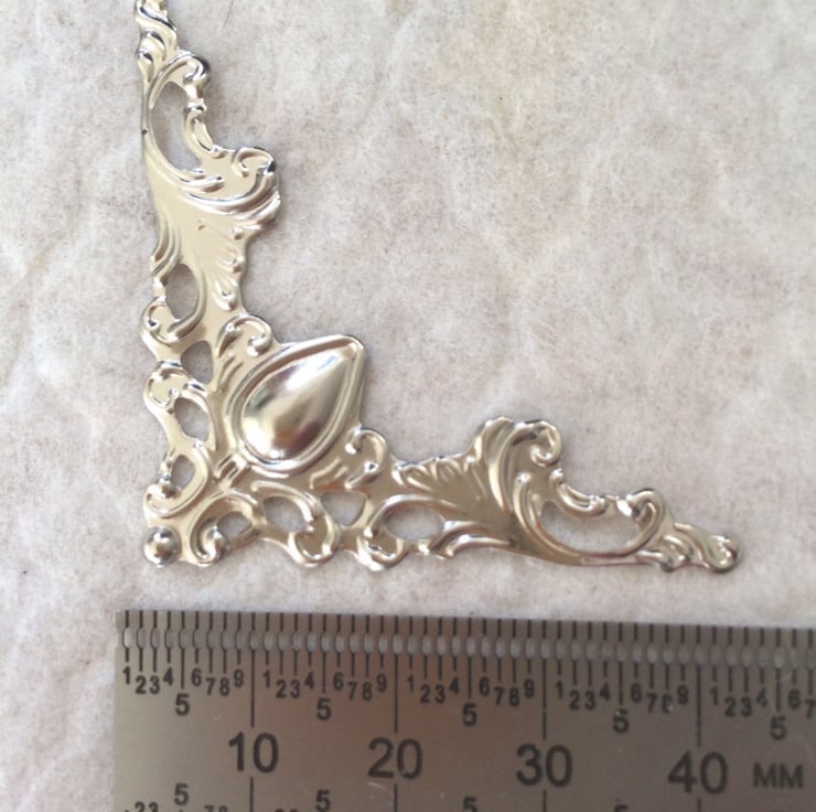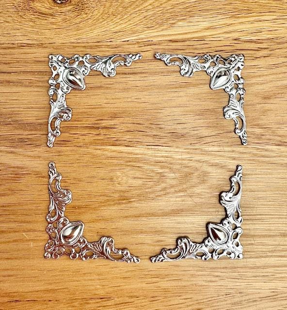 Silver coloured decorative book or album corners in packs of 4. These are NOT the type of corner that fits directly over the corner of a book as a protector, but are to be glued to the front cover of a book in the corner, and are as a decoration only.