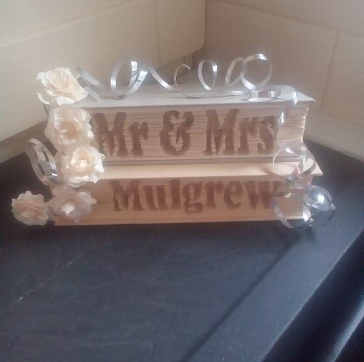 This listing is for a set of book folding patterns that enables you to create your own Mr & Mrs book. The 1st pattern will read Mr & Mrs (Mr & Mr and Mrs & Mrs can be requested also) and will be based on a 20cm book. The 2nd or/and 3rd pattern(s) will be made in the surname of your choosing and based on a 23cm book(s). A free written tutorial is included to guide you through the folding process.