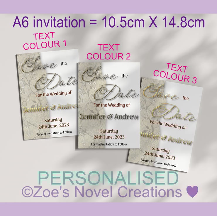 Invite guests to attend your wedding with these personalised Save the Date cards. You can order a full sized (A6) personalised sample.These invitations will be printed on high quality cardstock. The colours may differ slightly due to different screen resolutions.