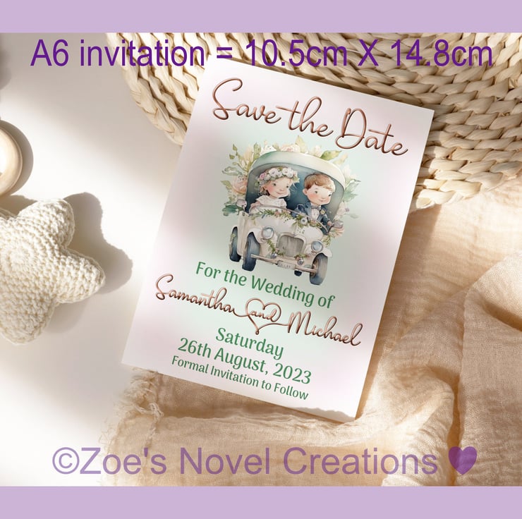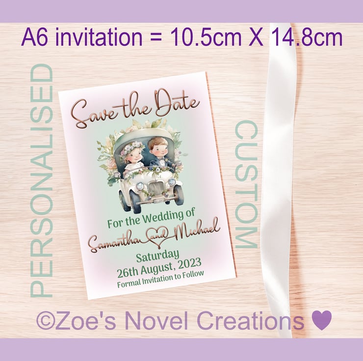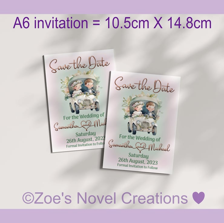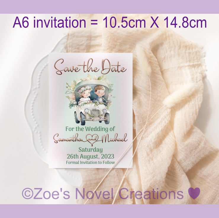 Invite guests to attend your wedding with these personalised Save the Date cards. You can order a full sized (A6) personalised sample.These invitations will be printed on high quality cardstock. The colours may differ slightly due to different screen resolutions.