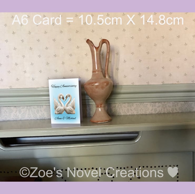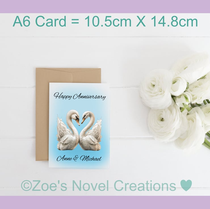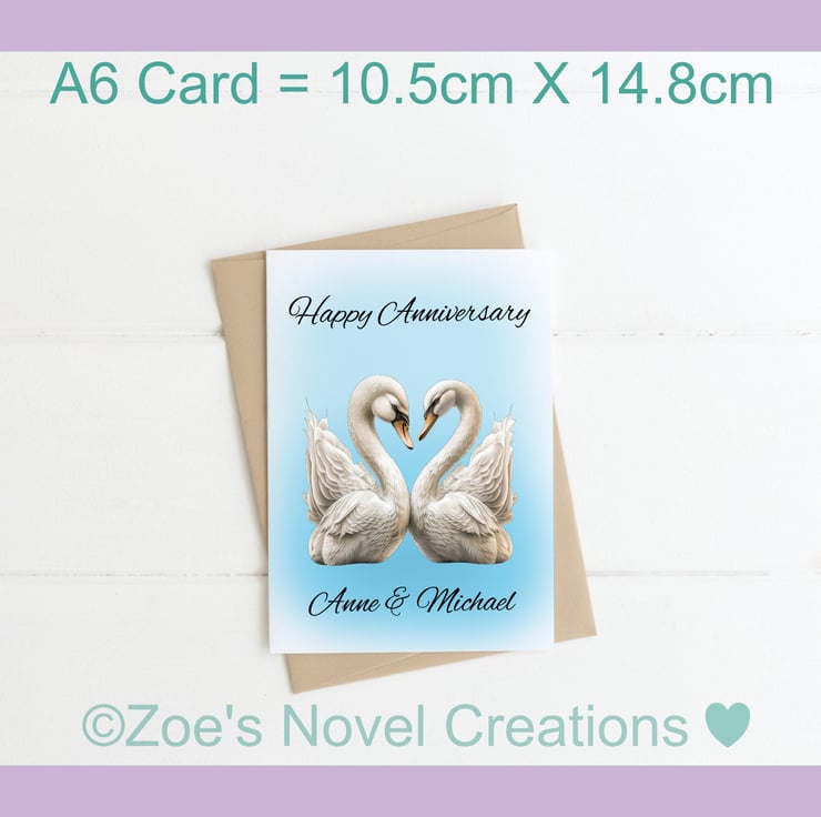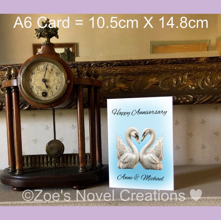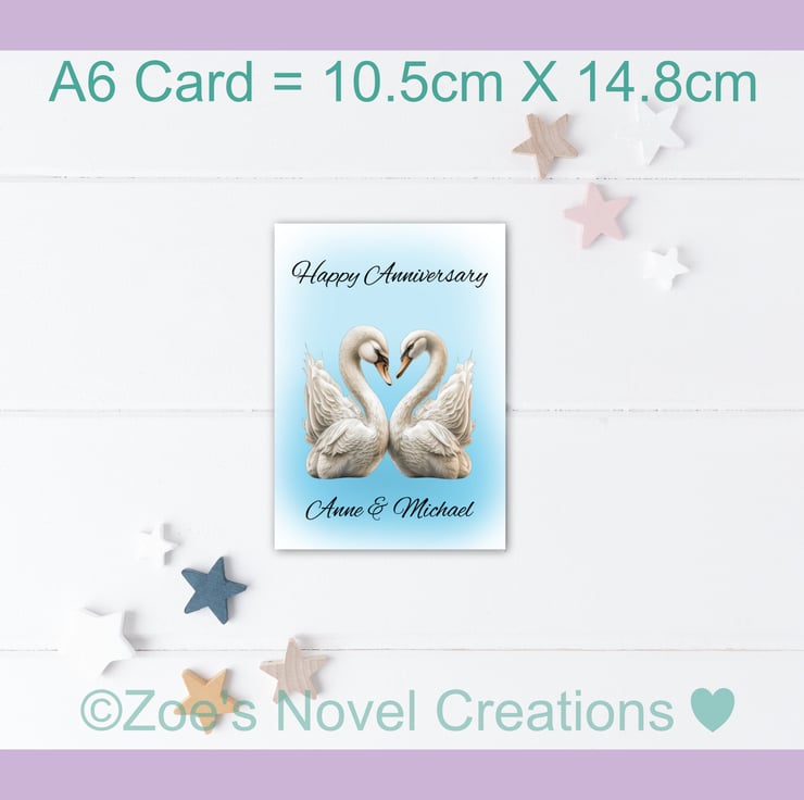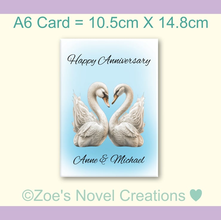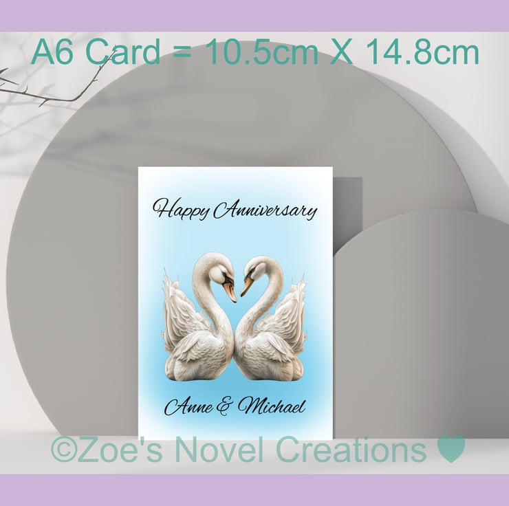 Swans Wedding Anniversary Card, personalised, A6 10.5cm x 14.8cm