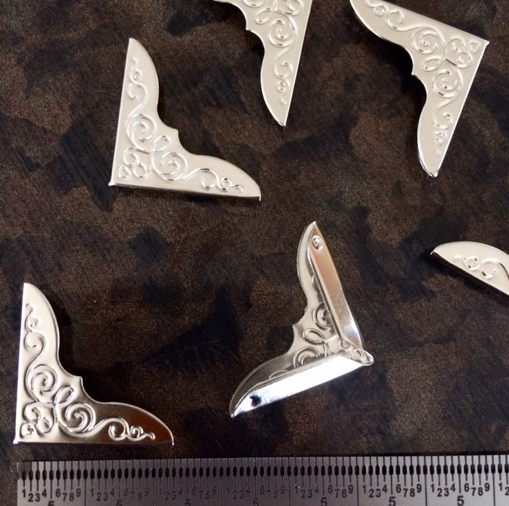 1 pack of silver 20 metal book corners. Enough for 5 books.Size 23mm each side and 32mm across the corner. Easy to fit and can be opened up to fit over book covers before tightening back up with your fingers or lightweight pliers.