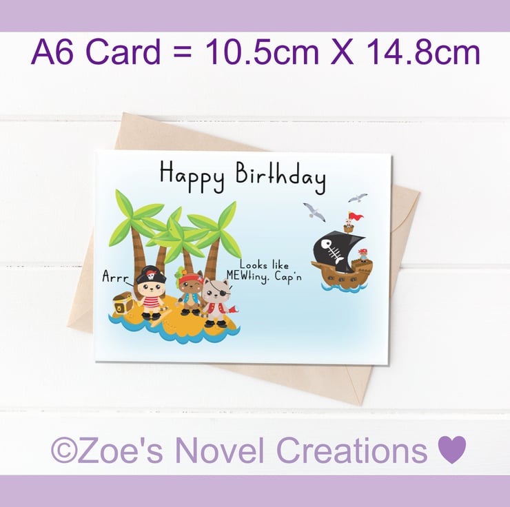 Pirate Cats birthday card, printed on high quality matt cardstock. The colours my differ slightly due to different screen resolutions.