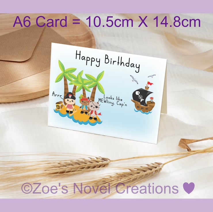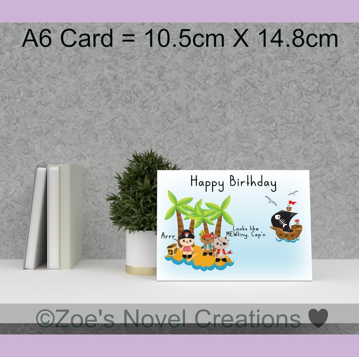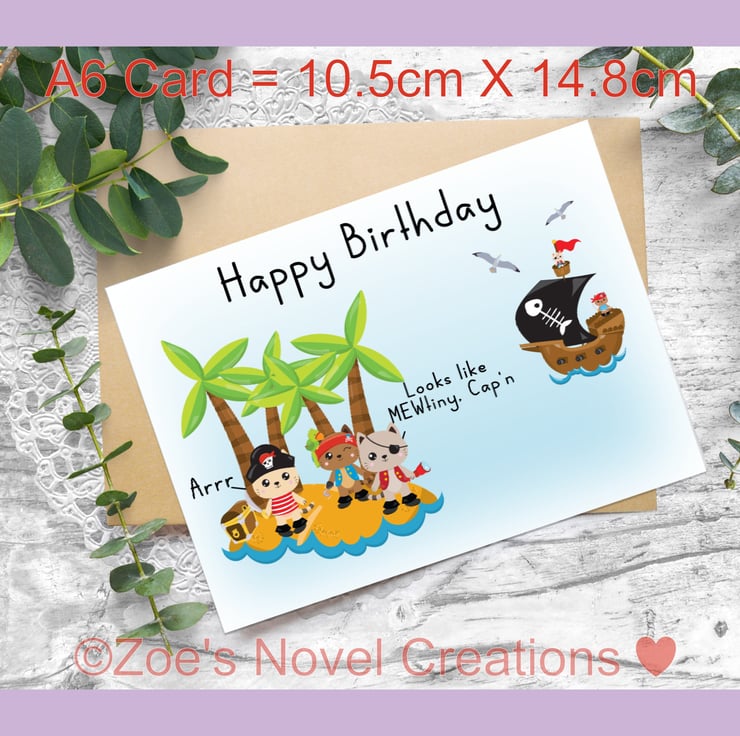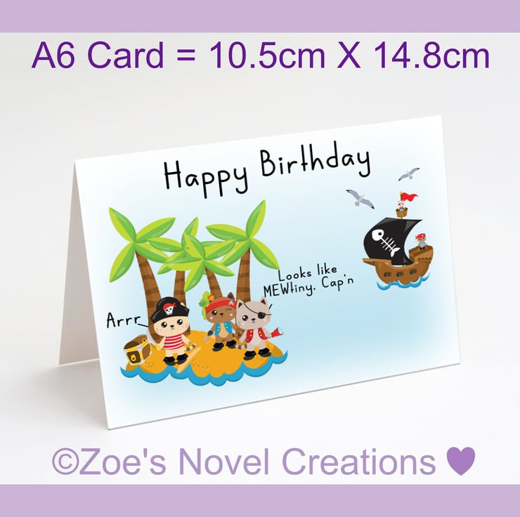 Pirate Cats birthday card, printed on high quality matt cardstock. The colours my differ slightly due to different screen resolutions.