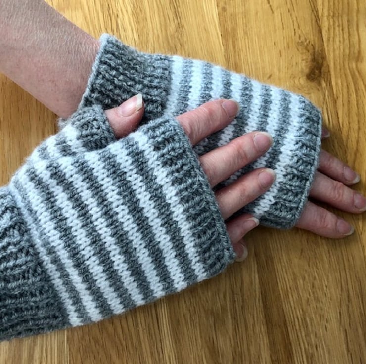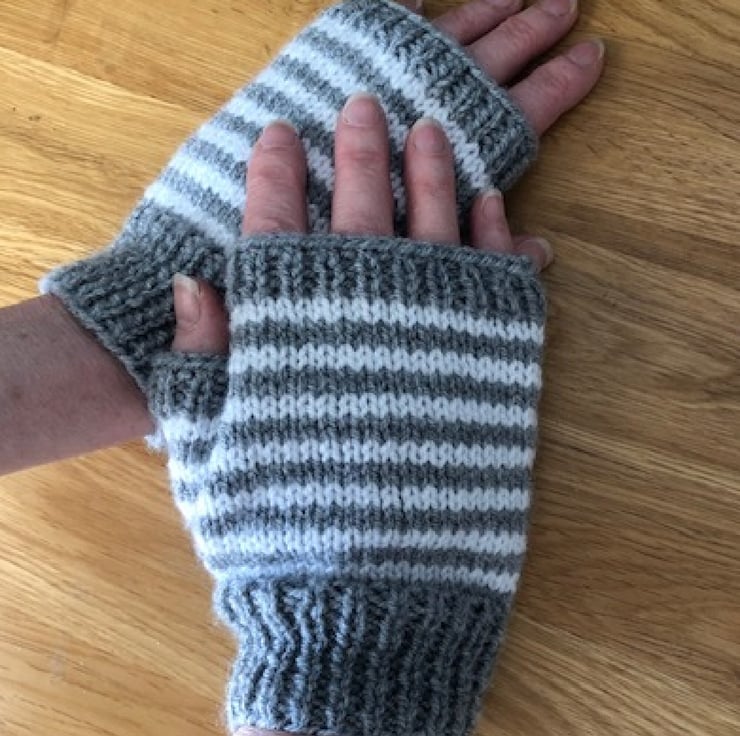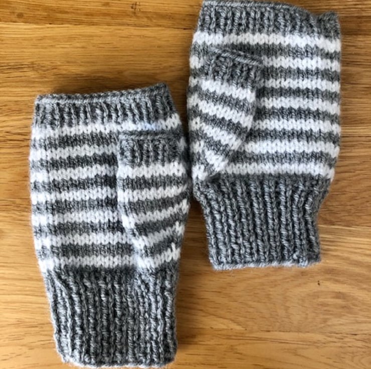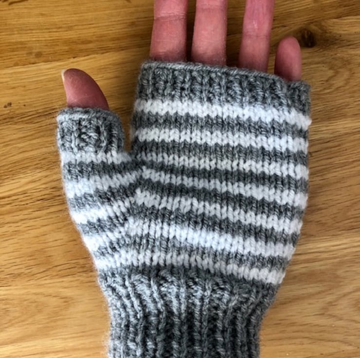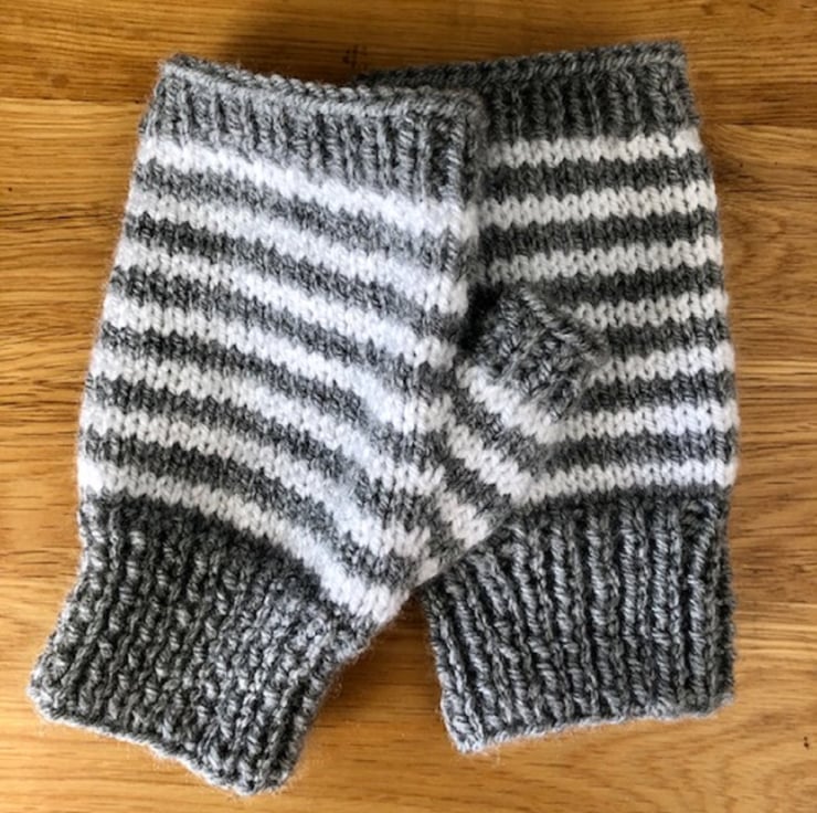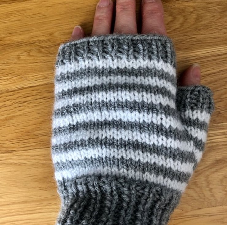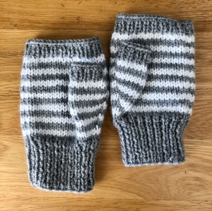 Hand Knitted, fingerless gloves or mitts in light grey & white (DK) yarn - One size -will fit most women.