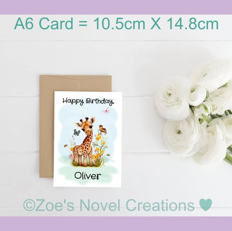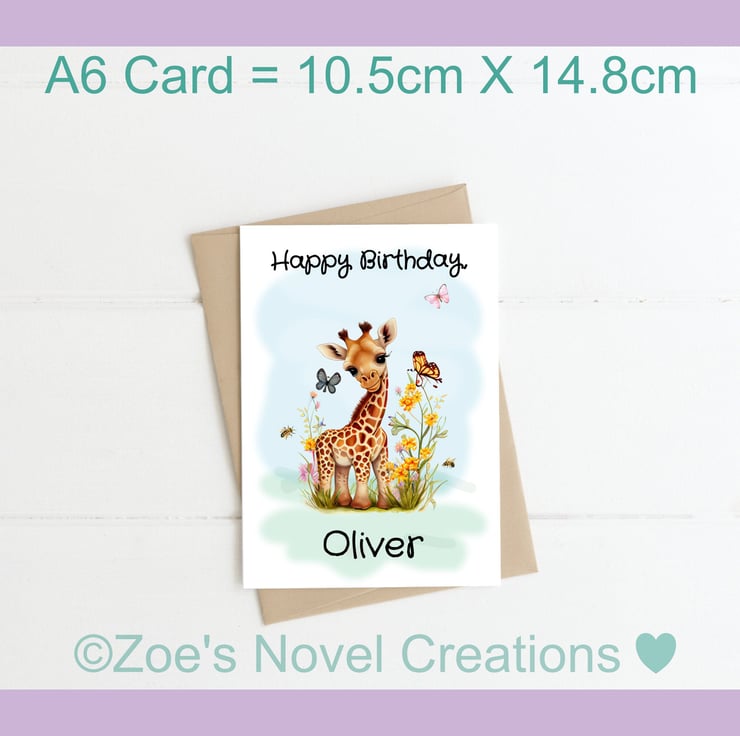Birthday Giraffe Greetings Card, personalised, A6 10.5cm x 14.8cm