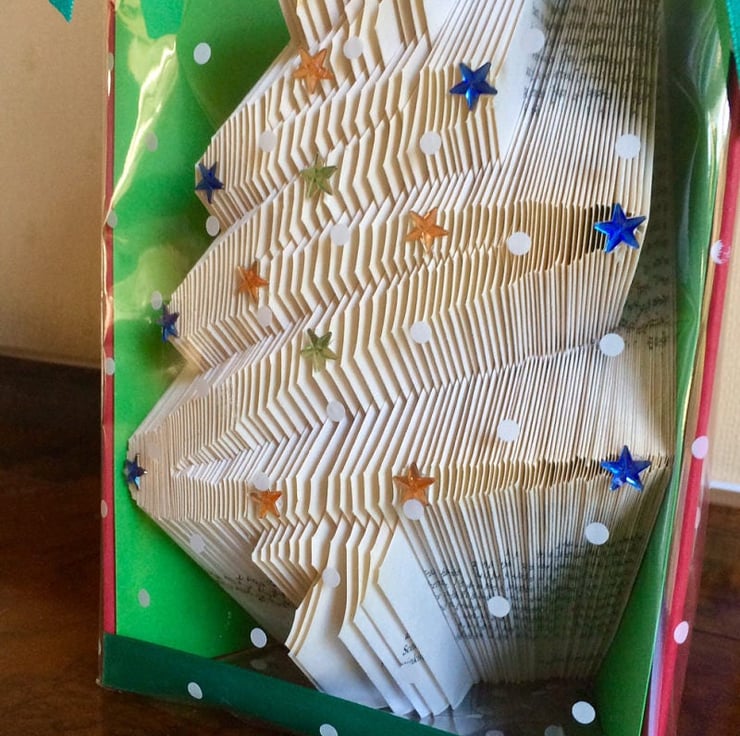 A book fold depicting an image of a Christmas Tree. The book is decorated with little coloured stars on the front, and the green and gold cover has a tiny sprig of holly.
