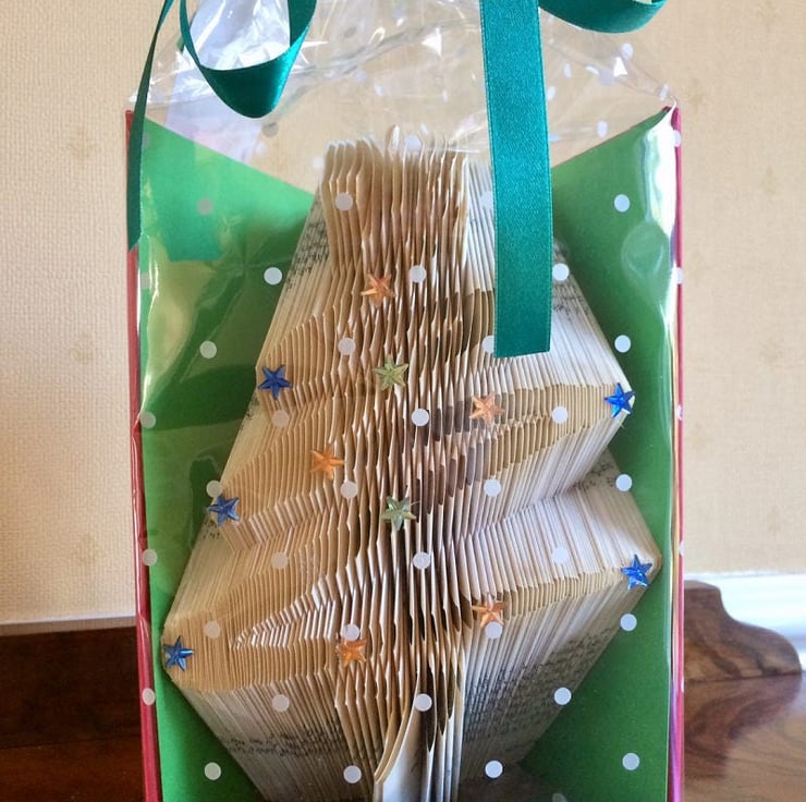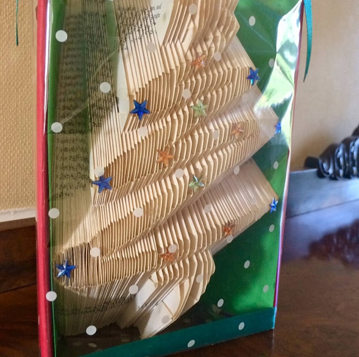 A book fold depicting an image of a Christmas Tree. The book is decorated with little coloured stars on the front, and the green and gold cover has a tiny sprig of holly.