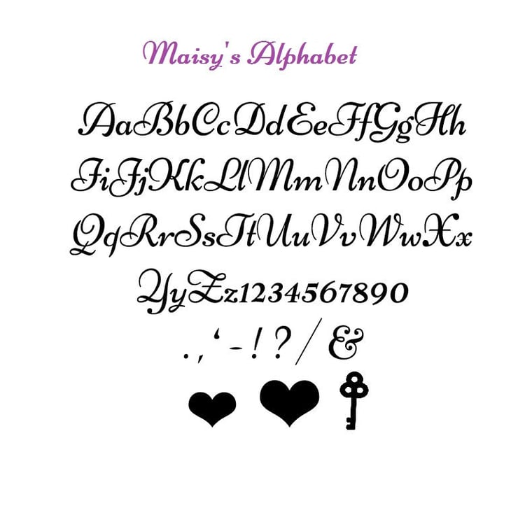 Alphabet contains all 26 letters in both upper & lower case. Numbers 0-9 Punctuation - full stop, comma, !, ? , , &, apostrophe, dash, large heart, small heart & key. 73 patterns in total.