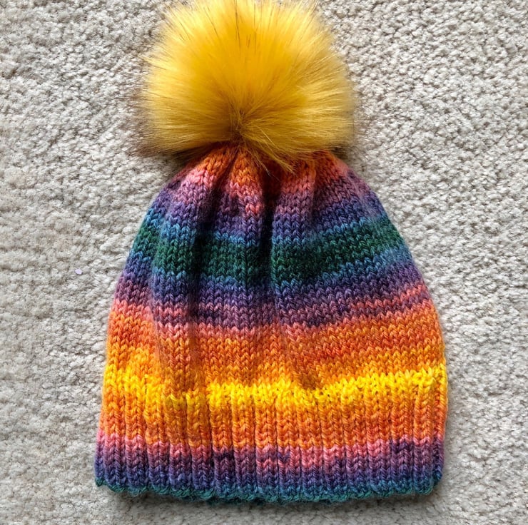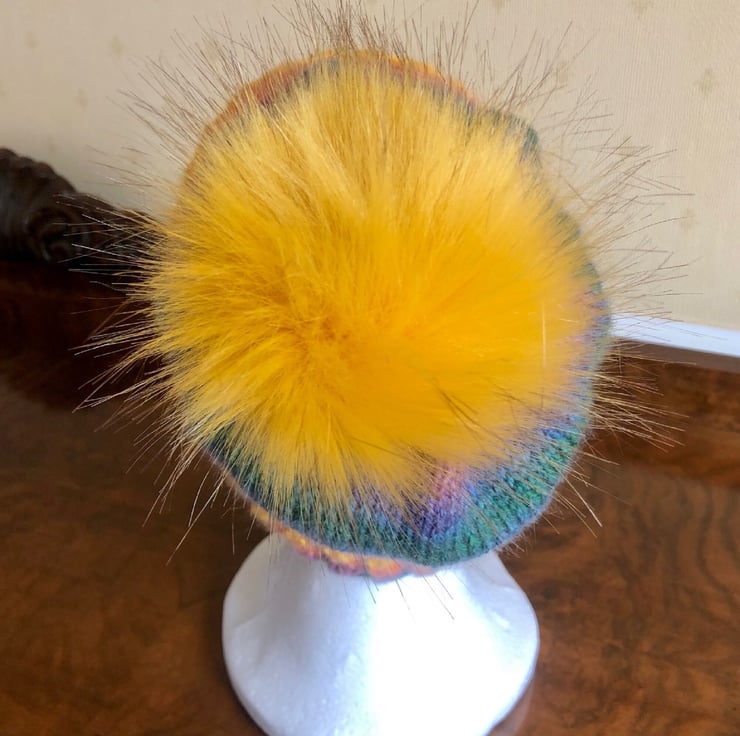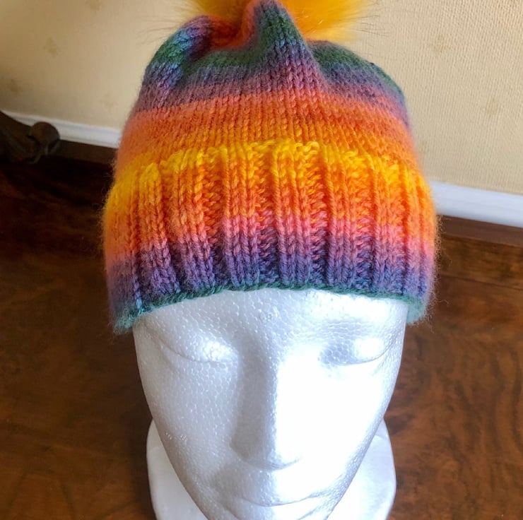 Multi-coloured Hand Knitted winter Hat (DK) with yellow coloured pom-pom - Will fit most adults but is in a Larger size. Makes a great Christmas gift