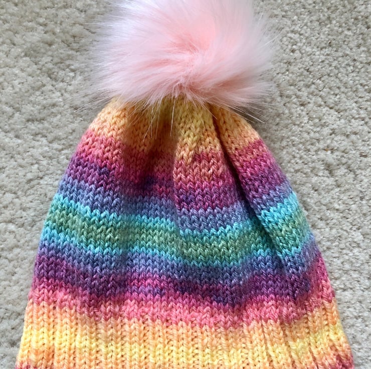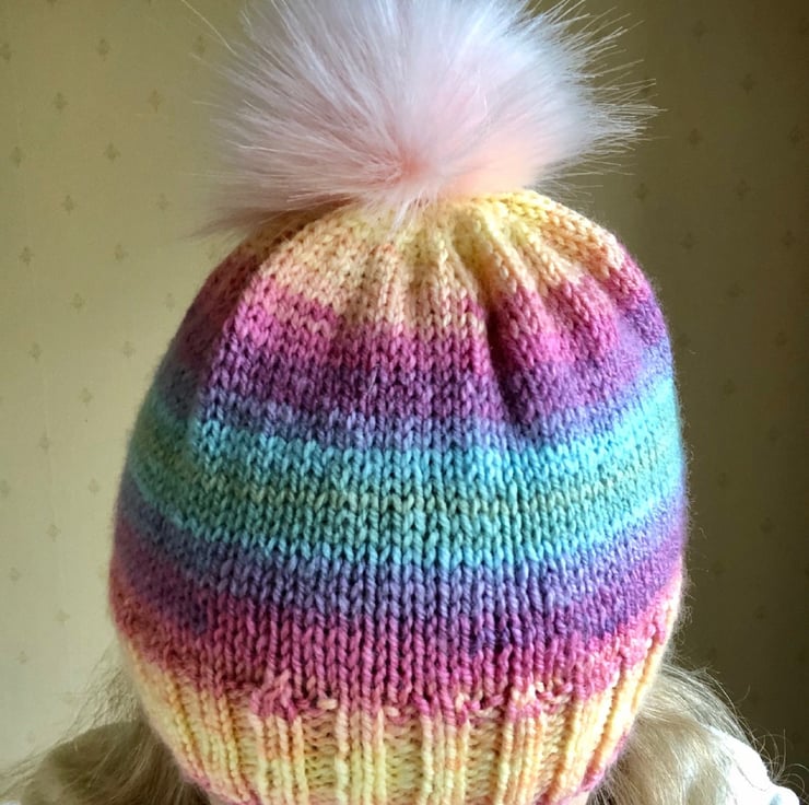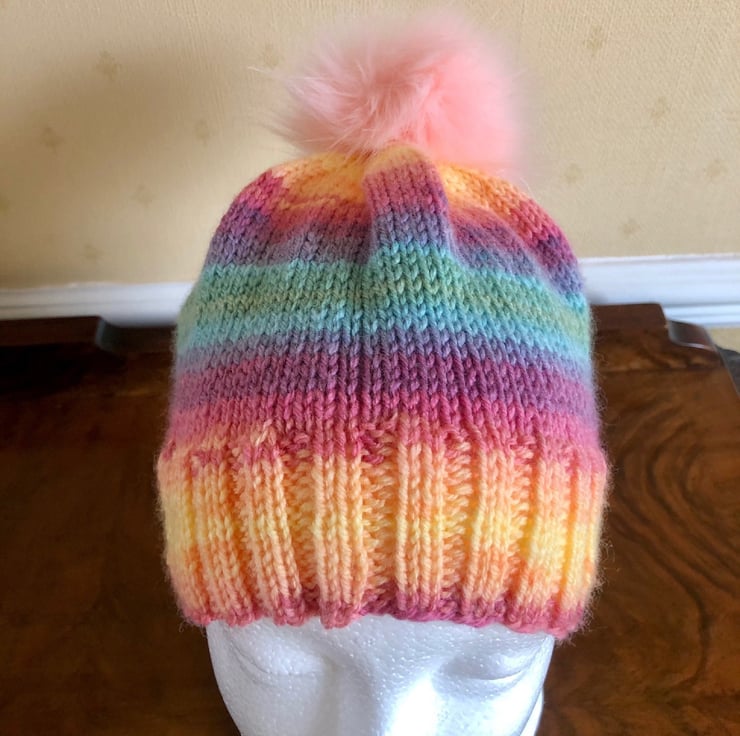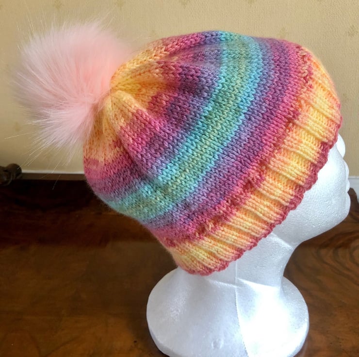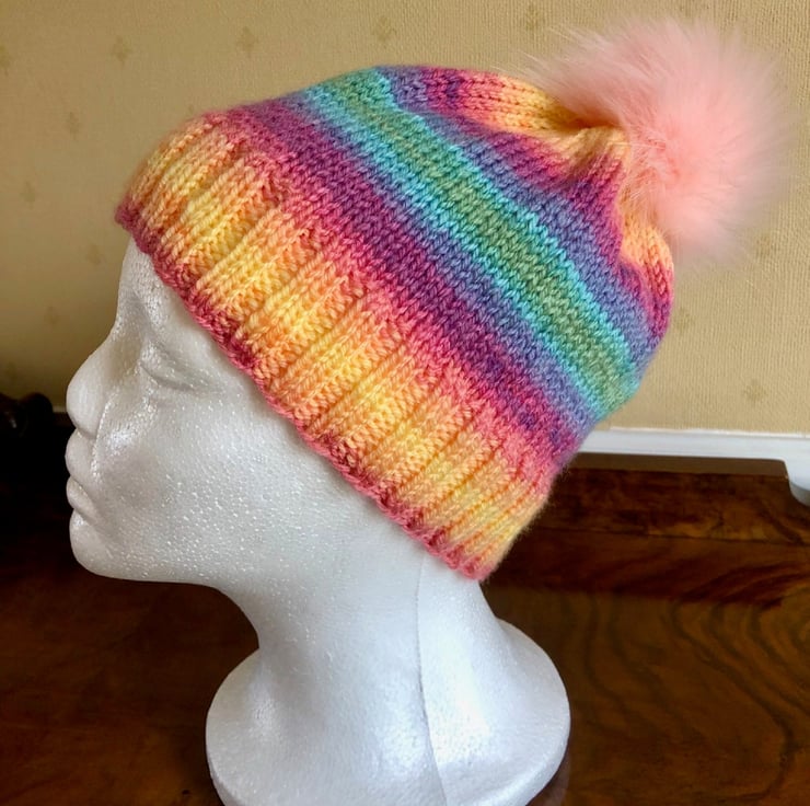 Multi-coloured Hand Knitted Hat (DK) with pale pink coloured pom pom - Will fit most adults but is in a Larger size