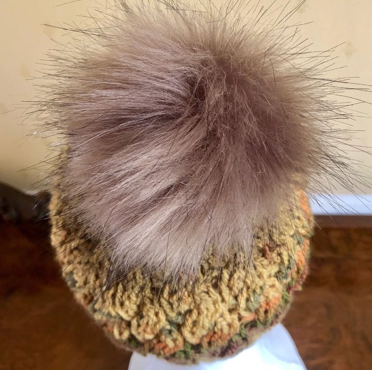 For ease of washing, the synthetic pom-pom is removable, and is attached inside with a hand crocheted button. This also, means that the hat can be worn either with, or without the pom-pom.