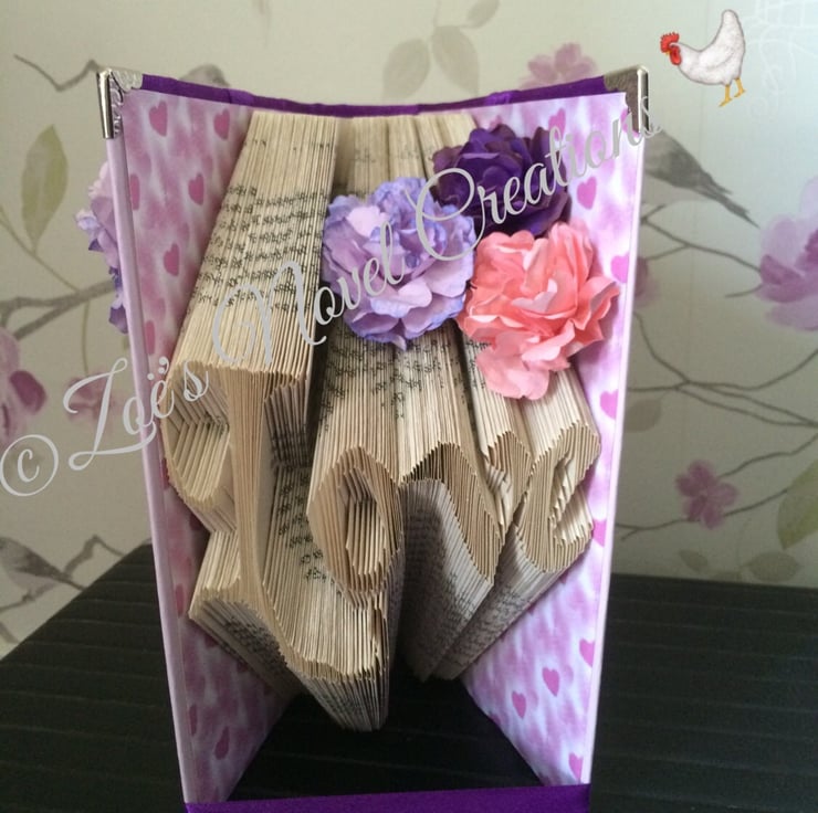 A book fold depicting the word Love. The book is decorated with coloured, vintage style, paper roses on the front and the cover shows flowers, hearts and butterflies.