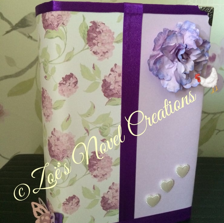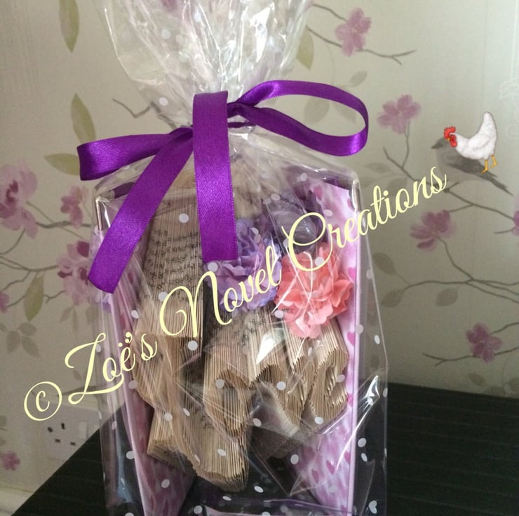 The gift has been beautifully packaged in cellophane wrapping and finished with a purple satin bow. The book measures approx. 21cm tall by 14cm deep and 12cm across the front.