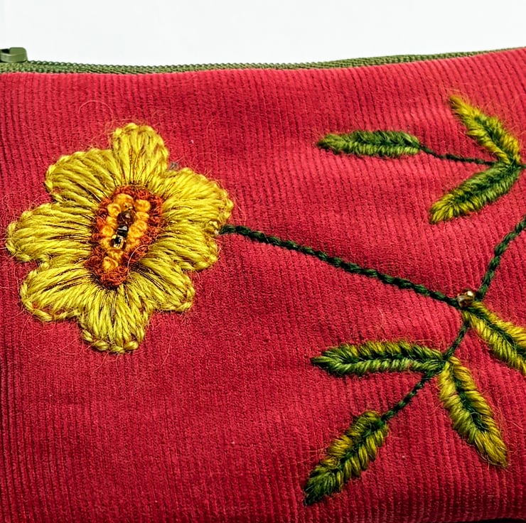 This little card and key purse (3" by 5"/7.5cm by 12.5cm) has been made in rust red corduroy fabric and has been embroidered with my Dog Rose embroidery design and enhanced with beading. The purse is wadded and fully lined with an up cycled silk scarf and has an olive green coloured zip and a rust wool plaited zip pull.
