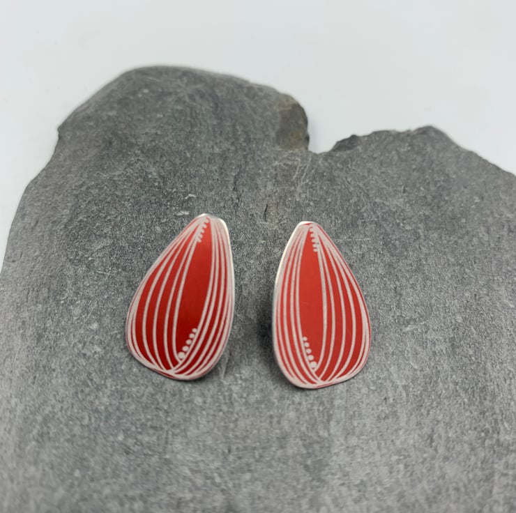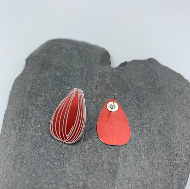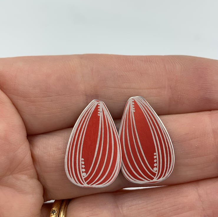 These stunning earrings feature a delicate, stylised tulip design laser-etched onto lightweight, dyed red aluminium. The design is inspired by the elegant curves of the Art Nouveau movement, with a subtle nod to Charles Rennie Mackintosh’s iconic style.