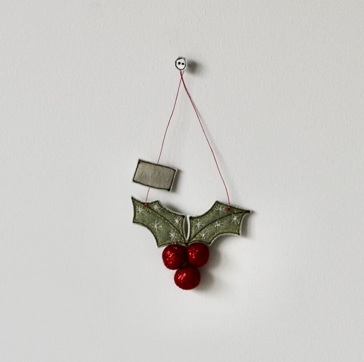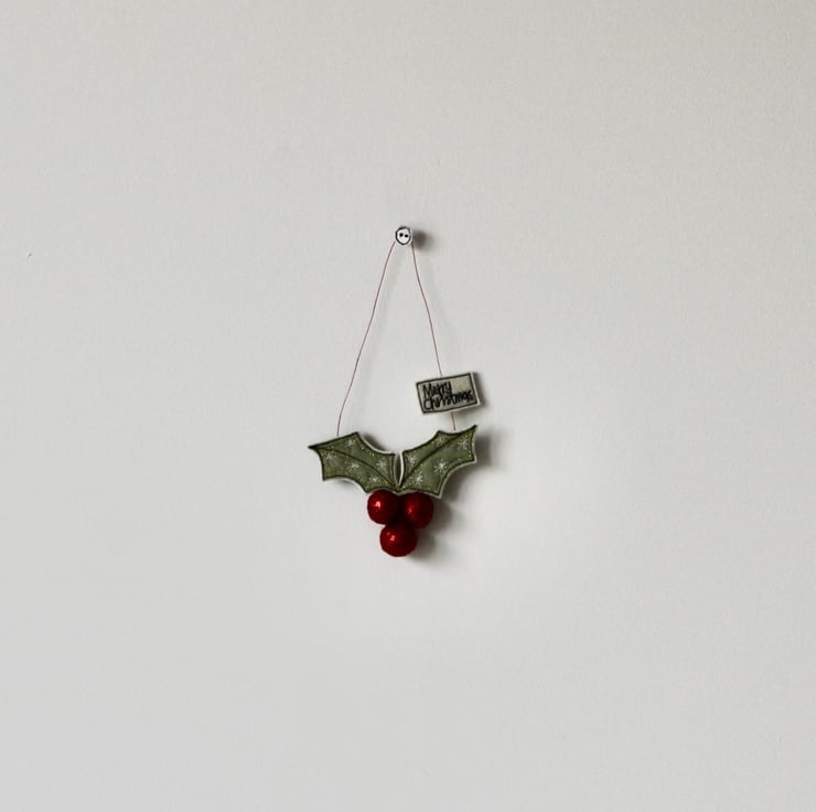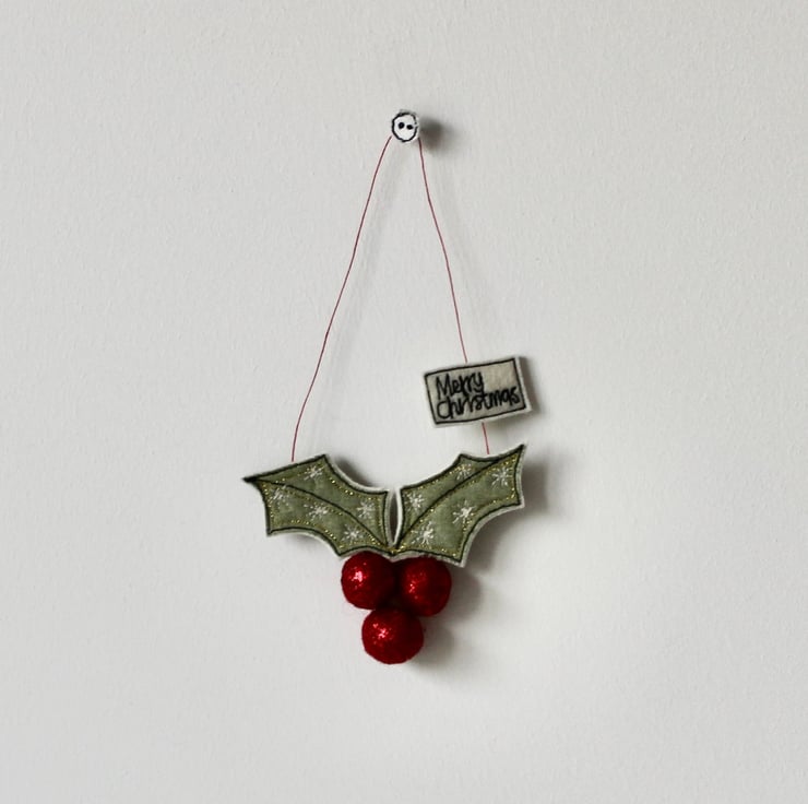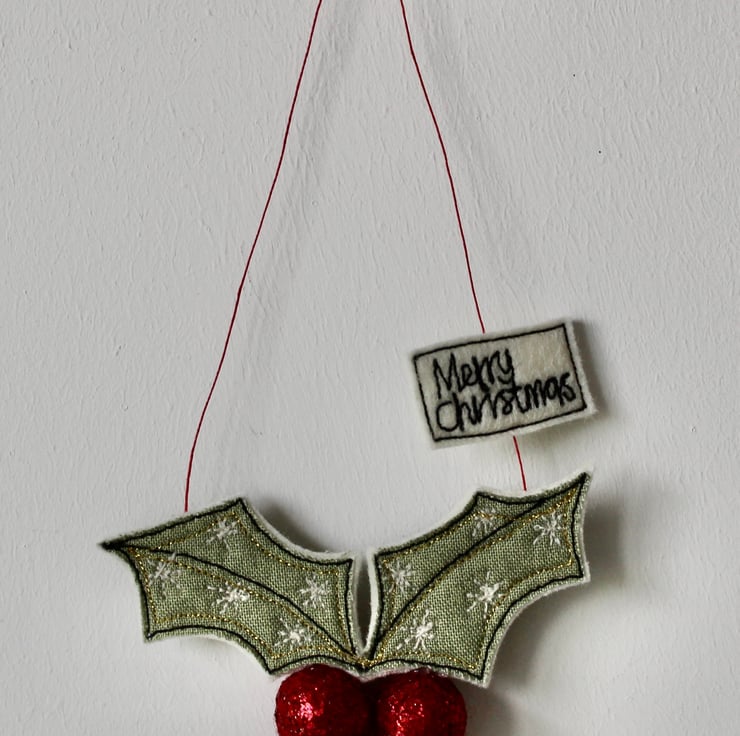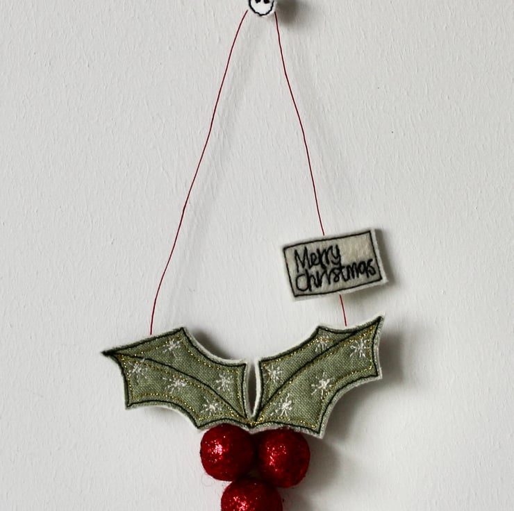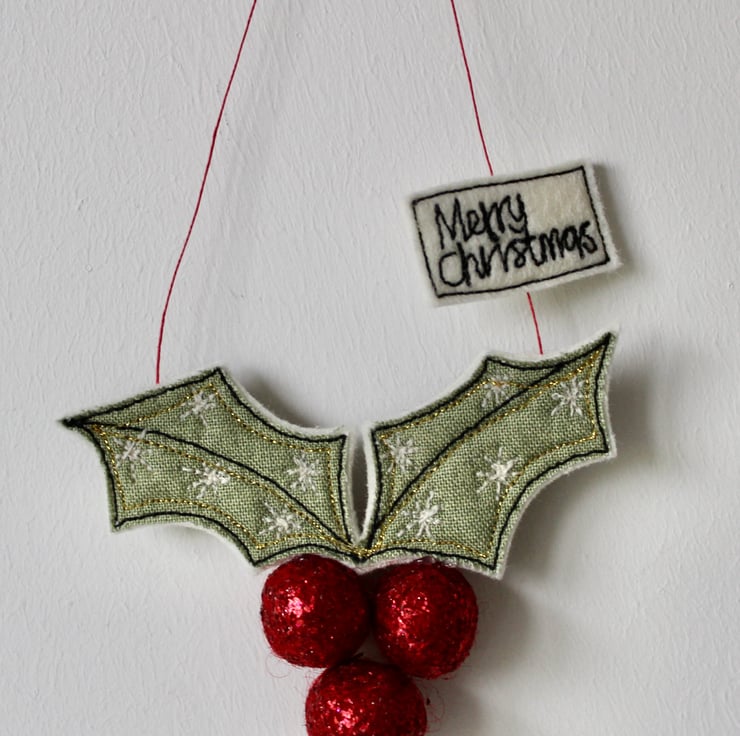 Holly is created using 100% wool felt, cotton cloth, metallic thread, free hand machine embroidery and is cut out by hand using very sharp scissors. Glittery red wool felt balls make perfect berries and a sewn label 'Merry Christmas' is attached to the linen thread for hanging.