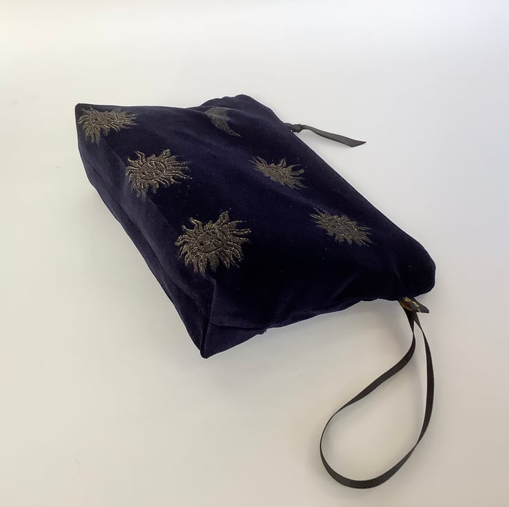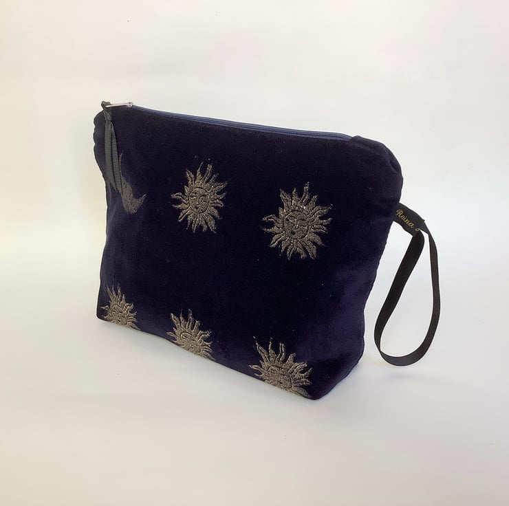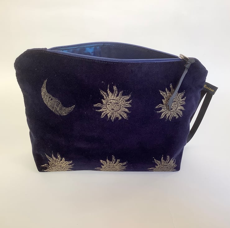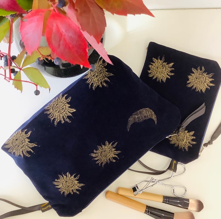 Indulge in luxury and make a statement with our Midnight Blue Sun and Moon Velvet Makeup Bag.