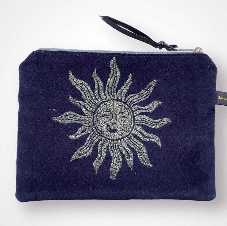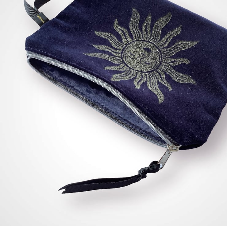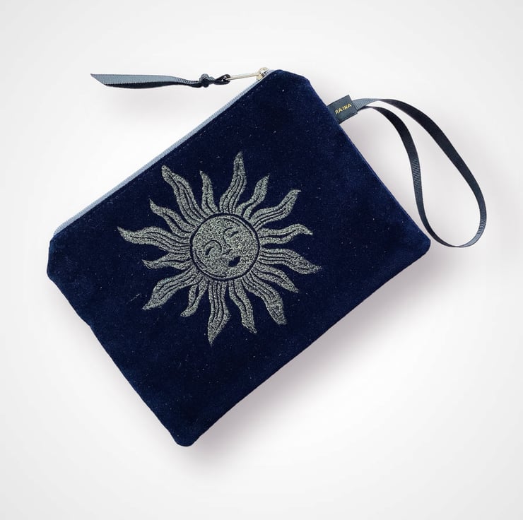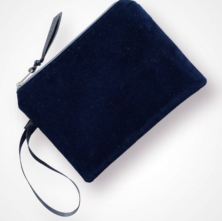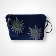 Introducing the exquisite Raina Atelier Midnight Blue Sun Velvet Zip-Up Pouch, a striking addition to your daily makeup routine and a unique accessory.