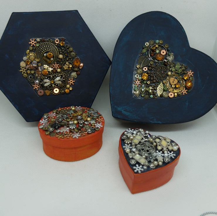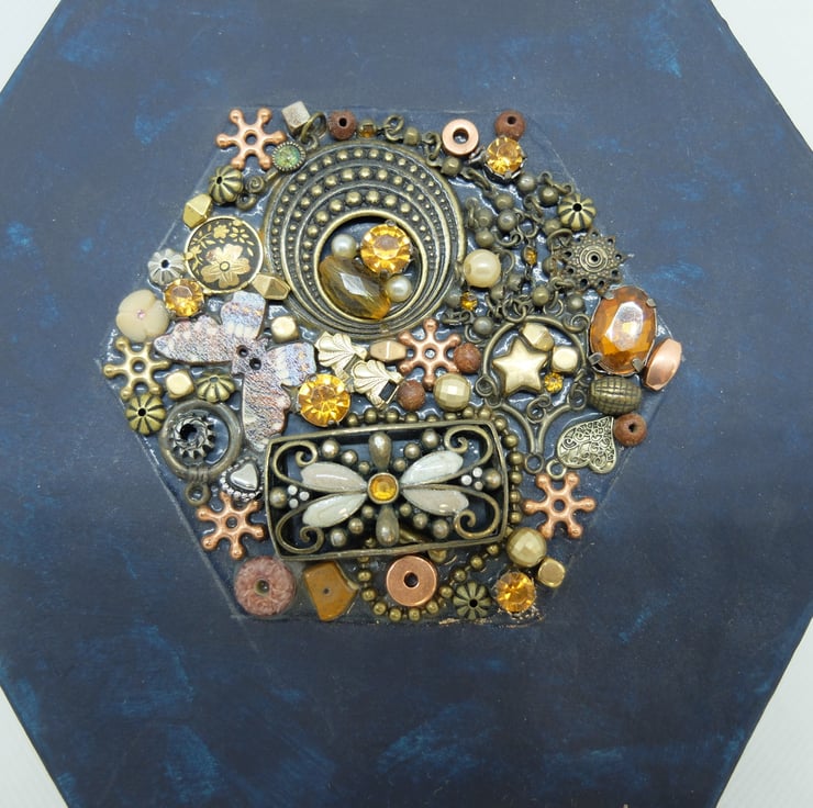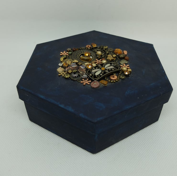Large Hexagonal lidded gift box, painted in dark blue with applied beads and shiny bits to the lid. NOT a toy, not suitable for small children, just in case any small bits become unattached!