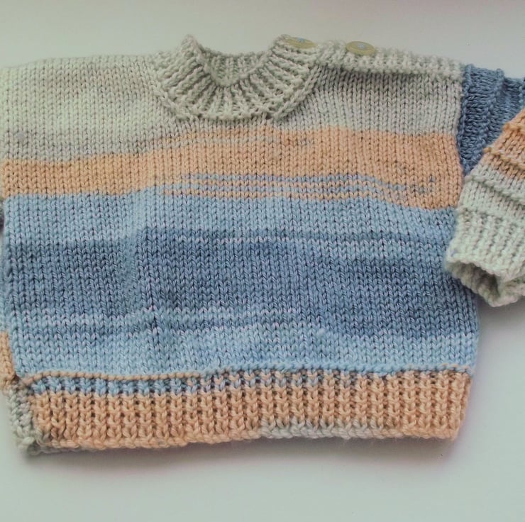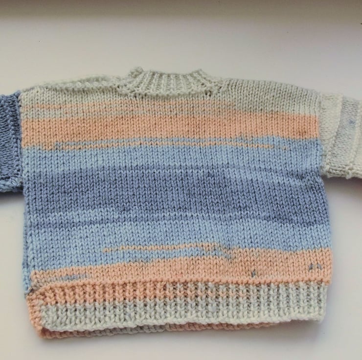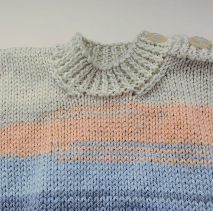 Hand knitted by me. Pastel Shades Babies Jumper sweater. Round neck with 2 button shoulder closure. Knitted in medium weight acrylic blend yarn. hm129