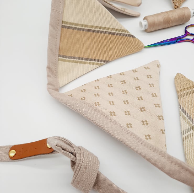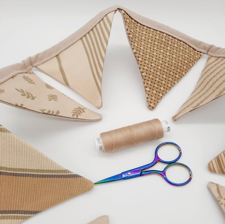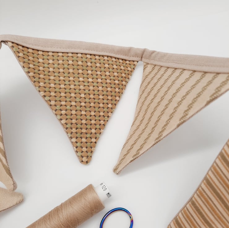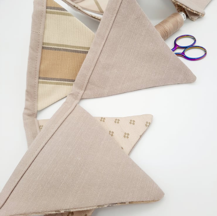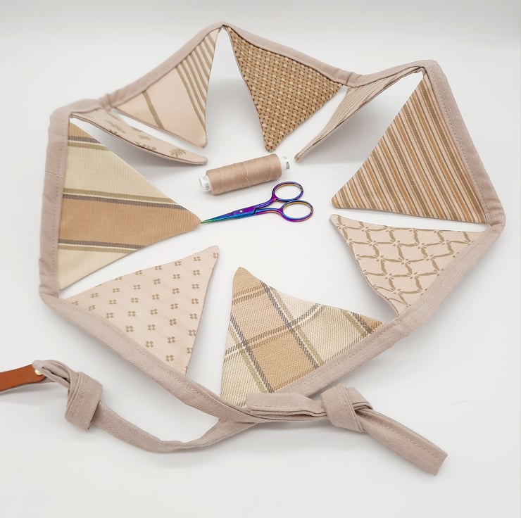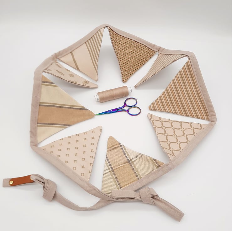 This fabric bunting has been made using 9 different contrasting fabrics. The patterns range from flowers, leaves, checks, dots, stripes and spirals.