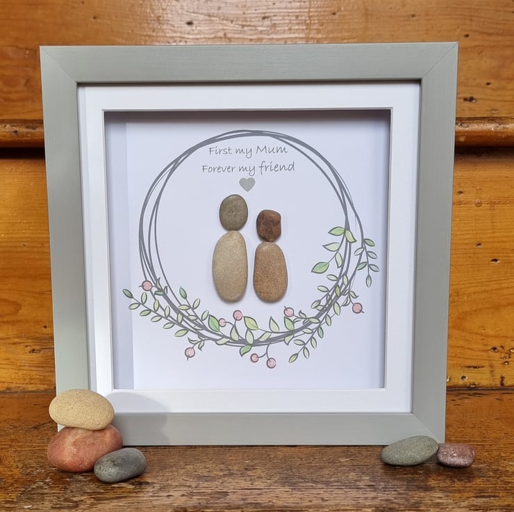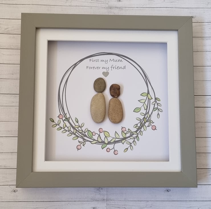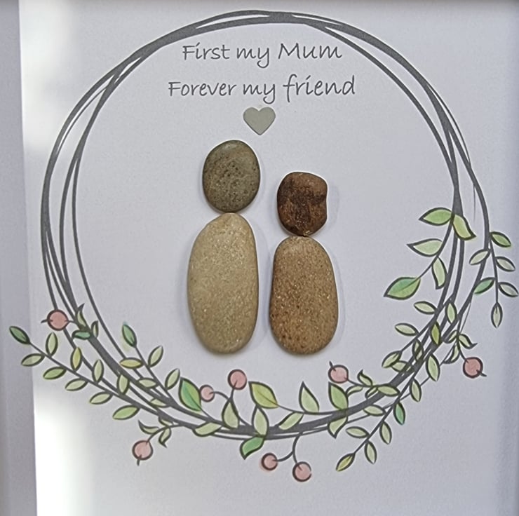 Beautiful handmade pebble art “First my Mum, forever my friend” picture that can be personalised to create a picture that is unique to every special Mum or Step-Mum.