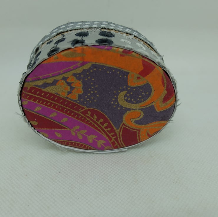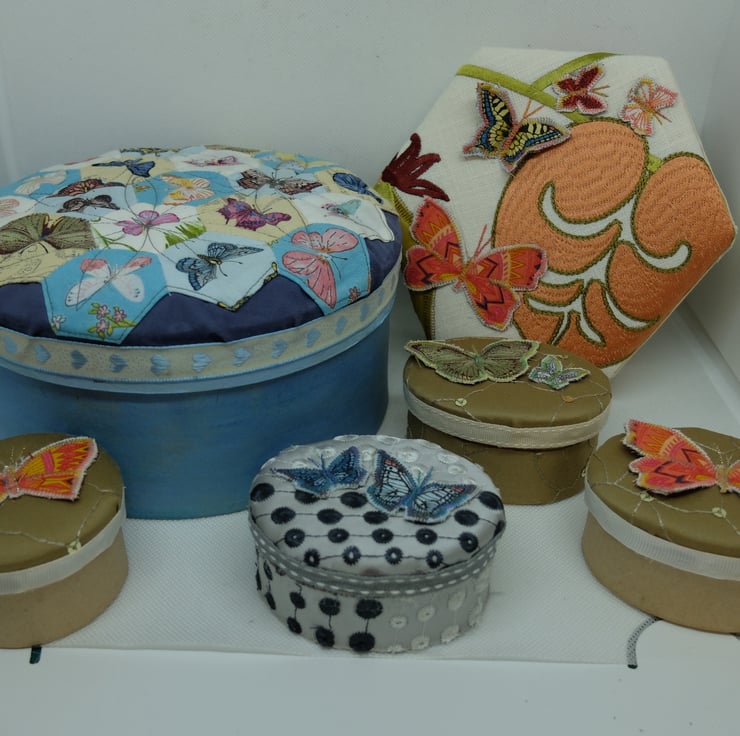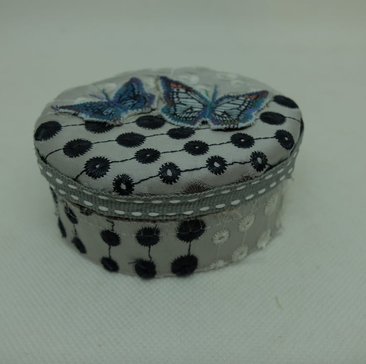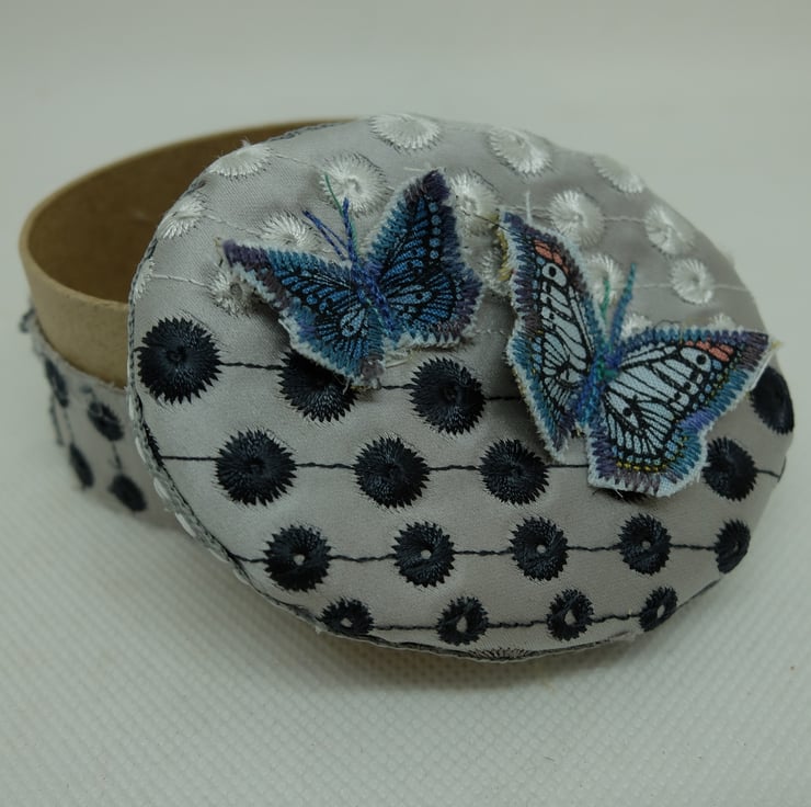 Small cardboard box covered with a silvery fabric, with two butterflies applied to the lid.
