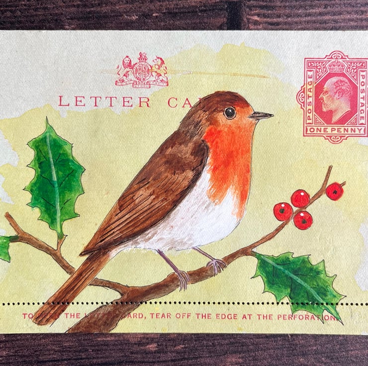 The robin has been painted with acrylics and inks onto the front of an unused King Edward VII one penny postcard. The card is blank on the reverse and measures 5.5 x 3.5 inches.