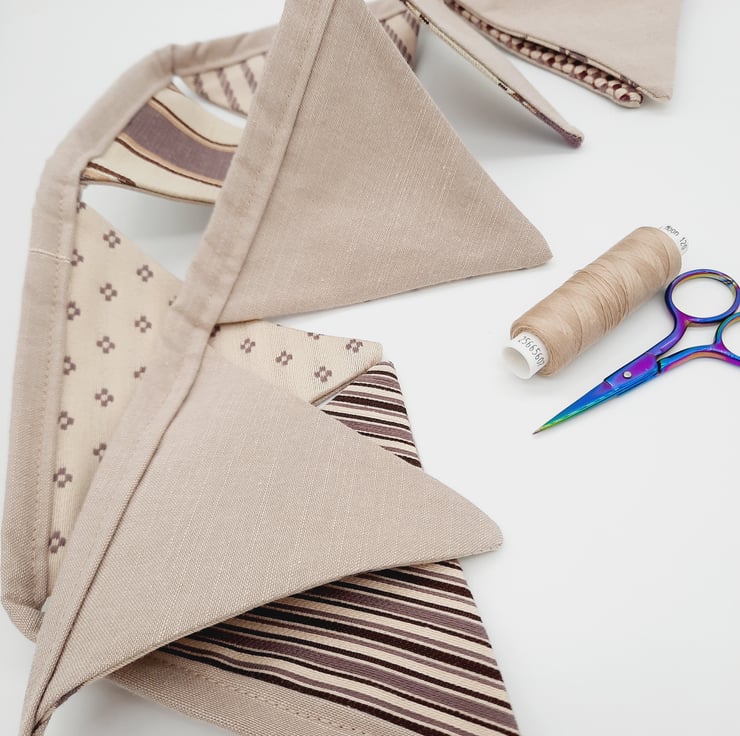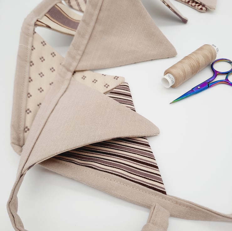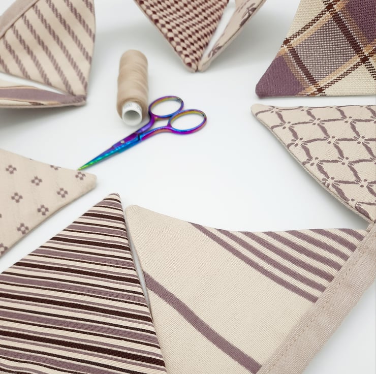 Fabric bunting in cream and purple, 9 triangles.