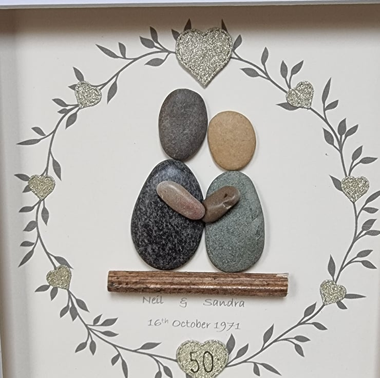 A truly unique, one of a kind, beautiful handmade pebble art “Anniversary” picture that can be personalised to create a picture that is unique to every couple. This picture would make the perfect gift for a spouse, friend or family member celebrating their special day. Making a perfect keep sake of their special anniversary.