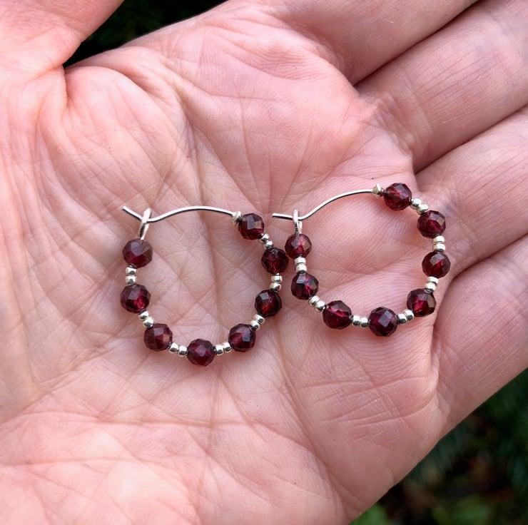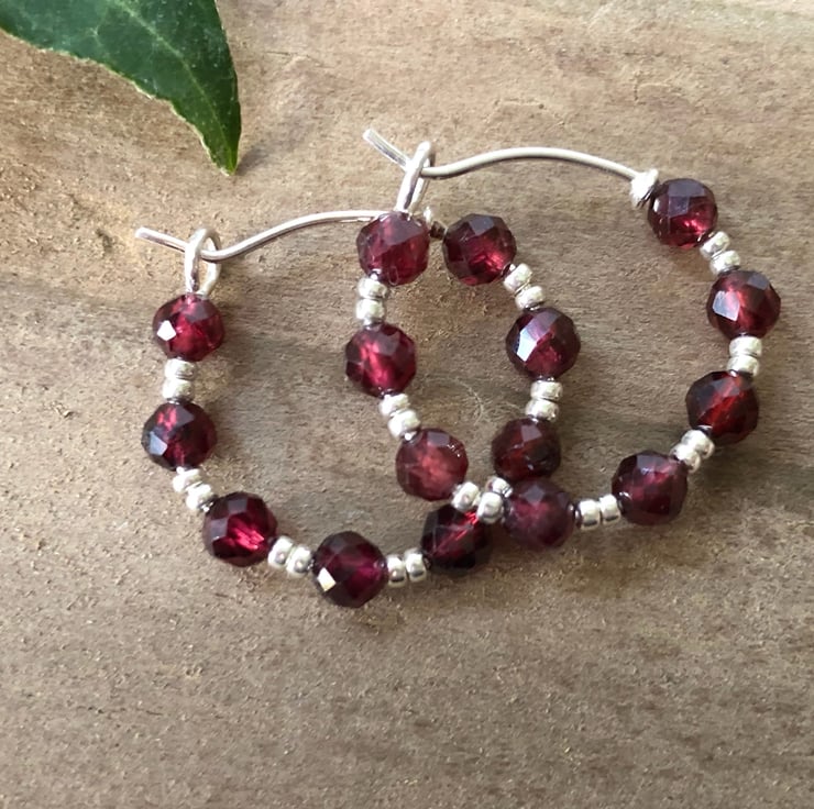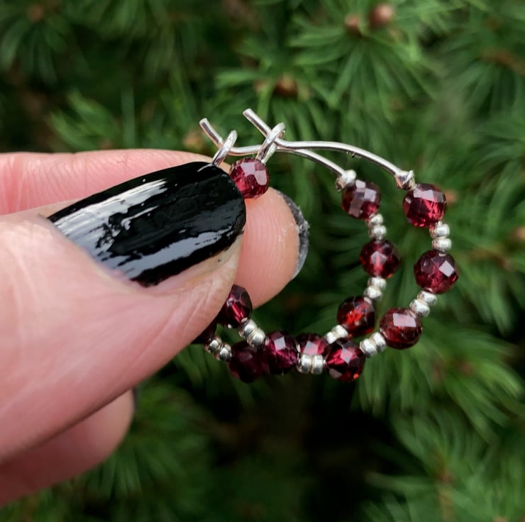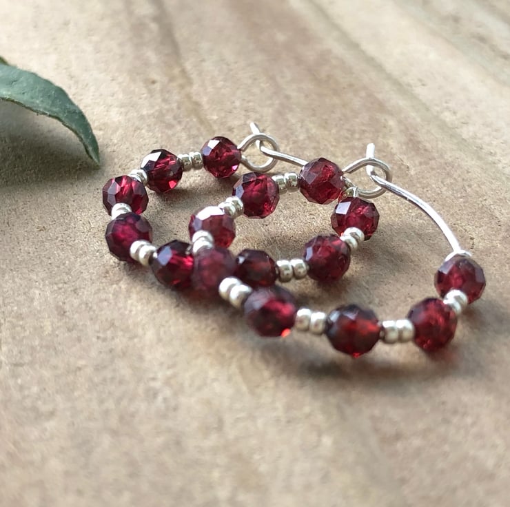 Lovely little beaded hoops. Sterling silver hoop earrings with sparkly deep red 3mm faceted Garnet gemstone beads and silver Miyuki seed beads.