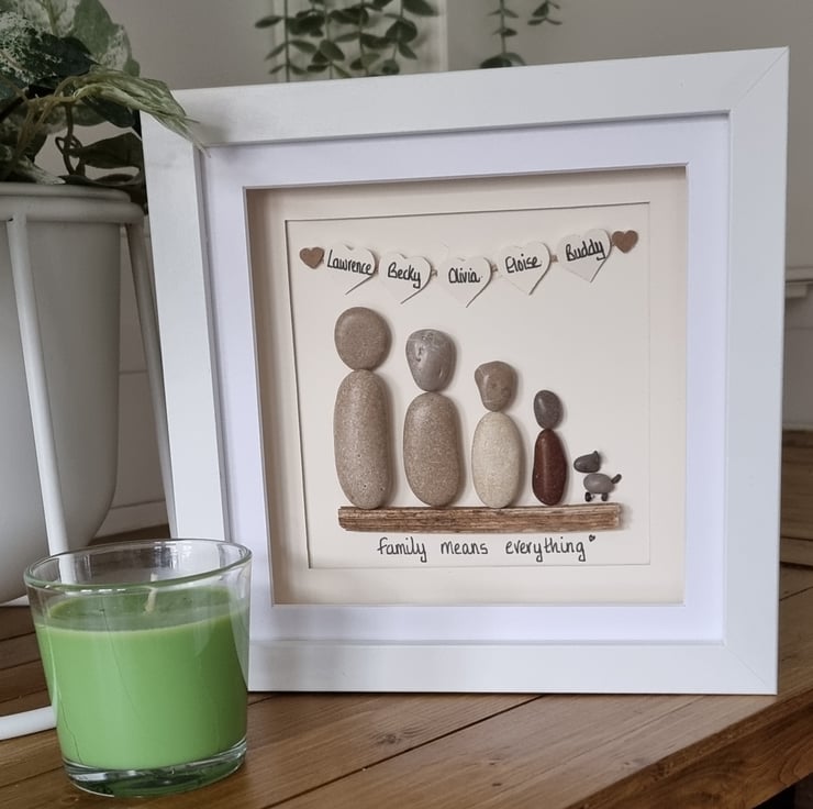 A truly unique, one of a kind, beautiful handmade pebble art “Family” picture that can be personalised to create a picture that is unique to every family. This picture can have additional people added and can include pets.