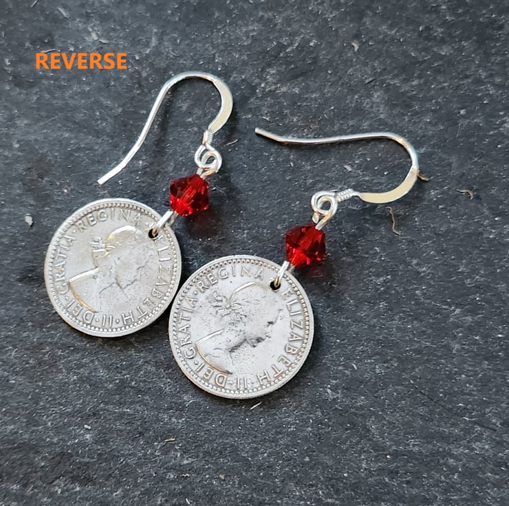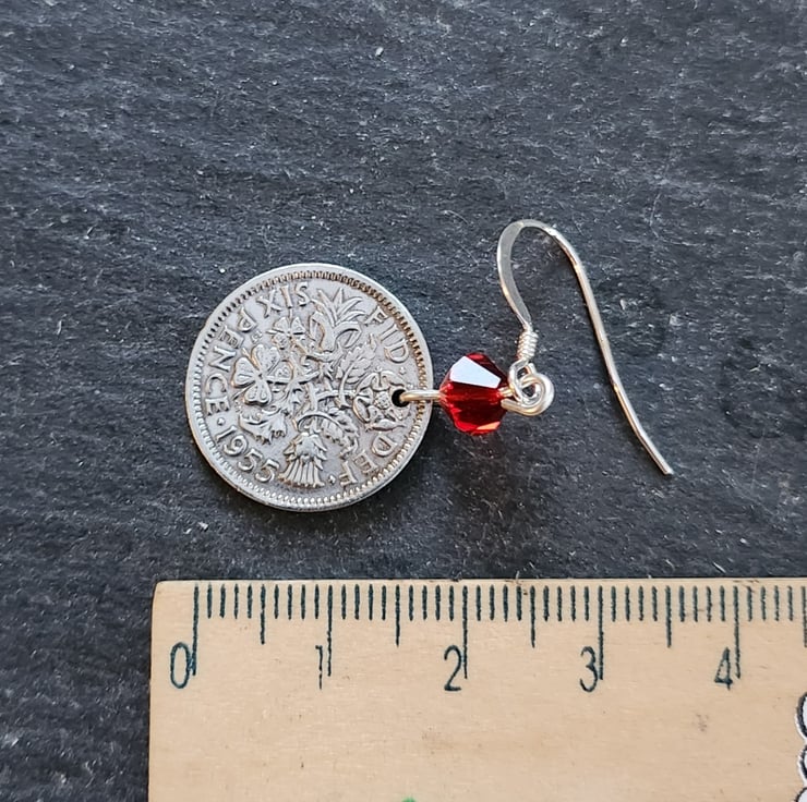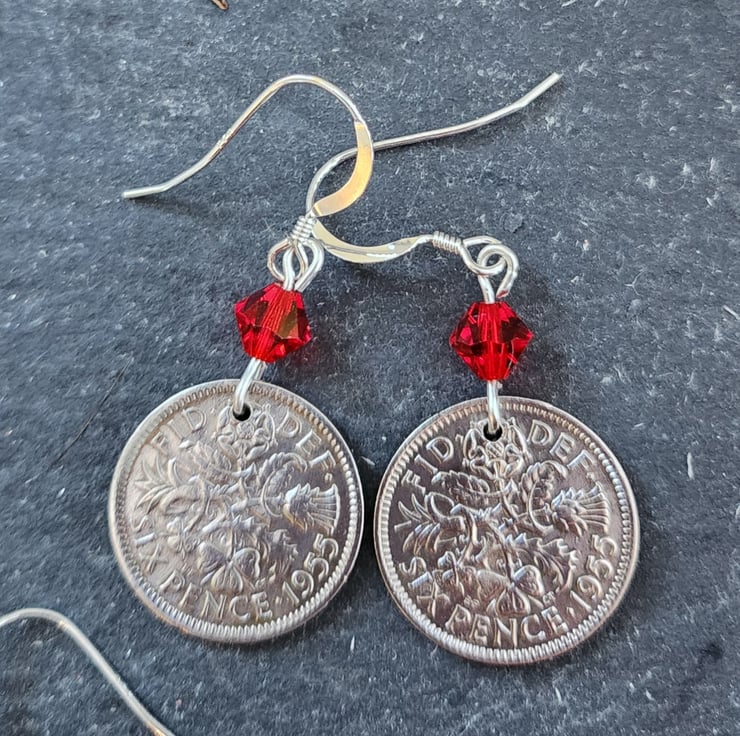 Pre-decimal sixpence (6d) coins from 1955. The ear wires are sterling silver, however, the sixpence by this time had no silver content whatsoever, they are cupronickel. Red preciosa crystals. Approximately 3cm drop.