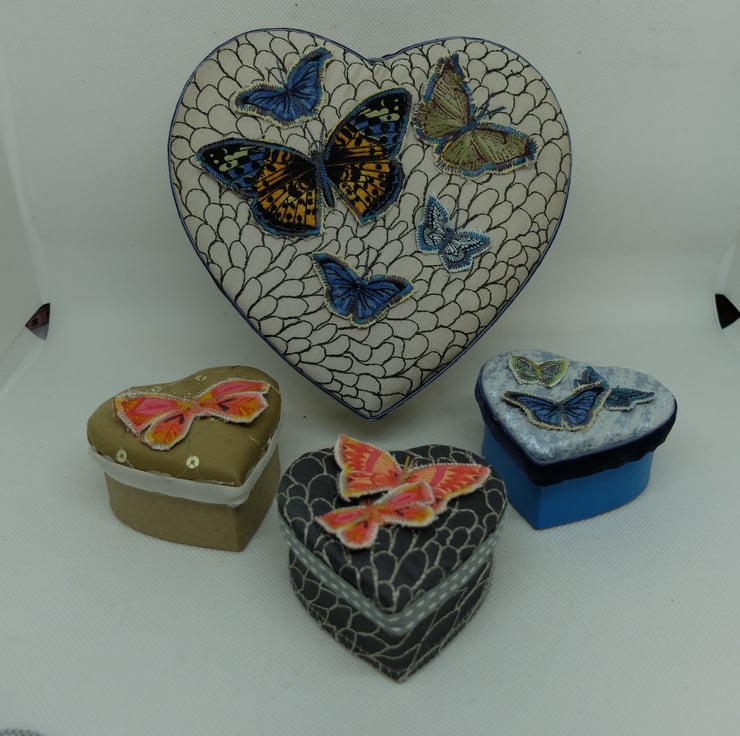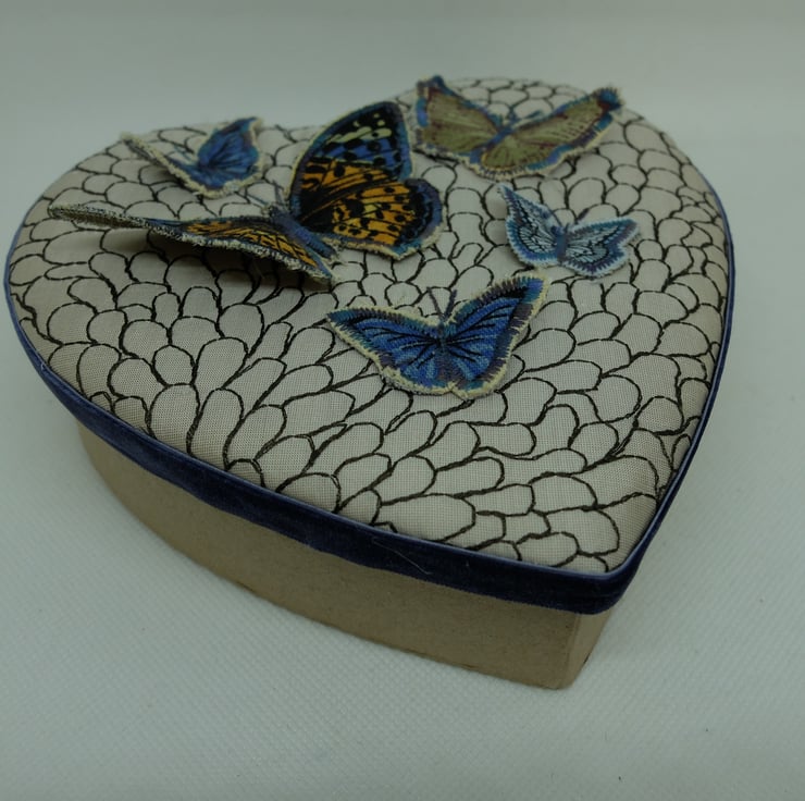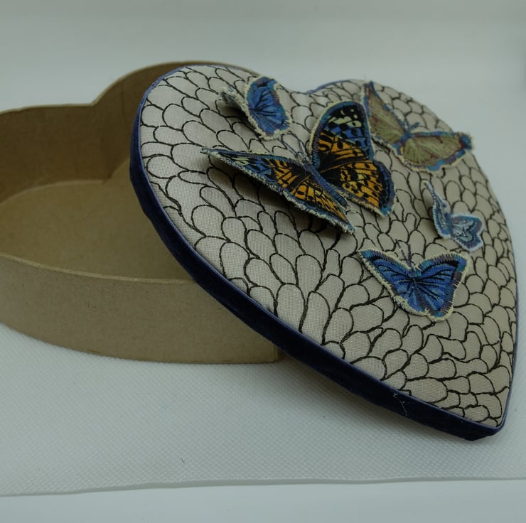 Cardboard heart-shaped gift box. The lid has been covered with ivory coloured fabric over padding and butterflies applied on top. Blue velvet ribbon round lid edge.