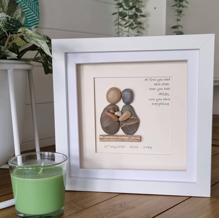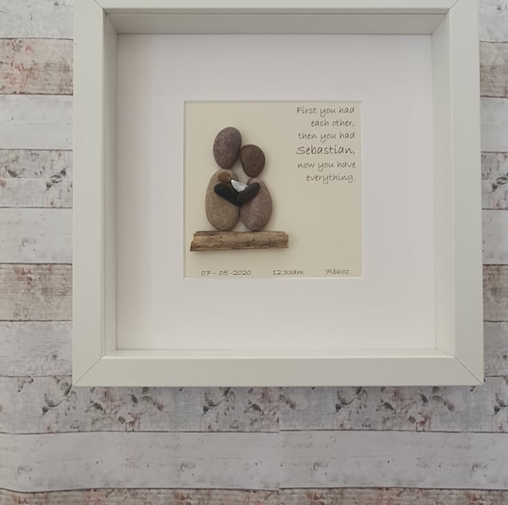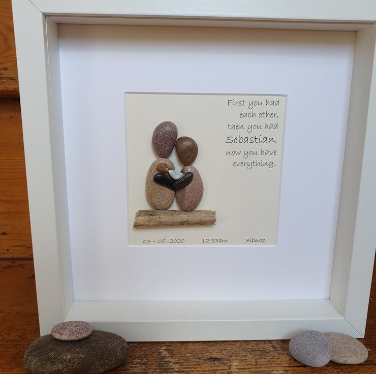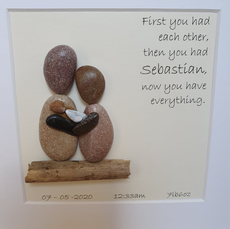 A truly unique, one of a kind, beautiful handmade pebble art "New Baby, New Family" picture that can be personalised to include baby's date of birth, weight, time of birth and place of birth to create a picture that is unique to every new family and their new baby.