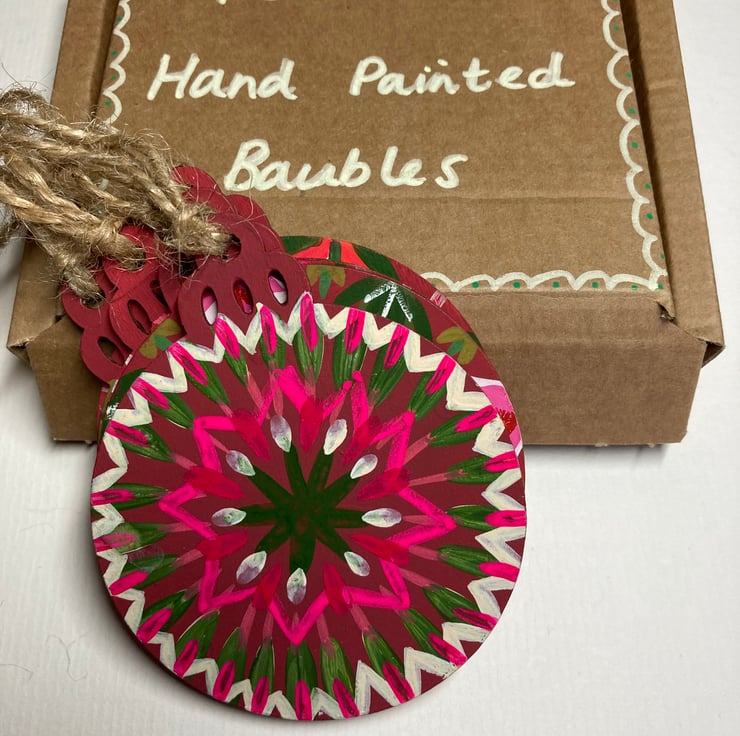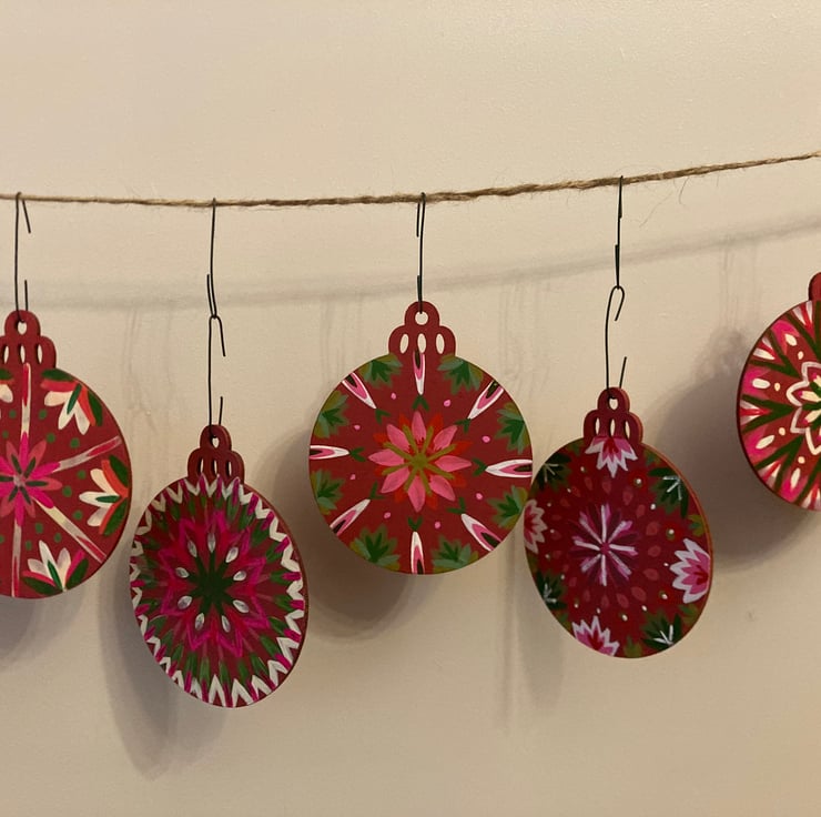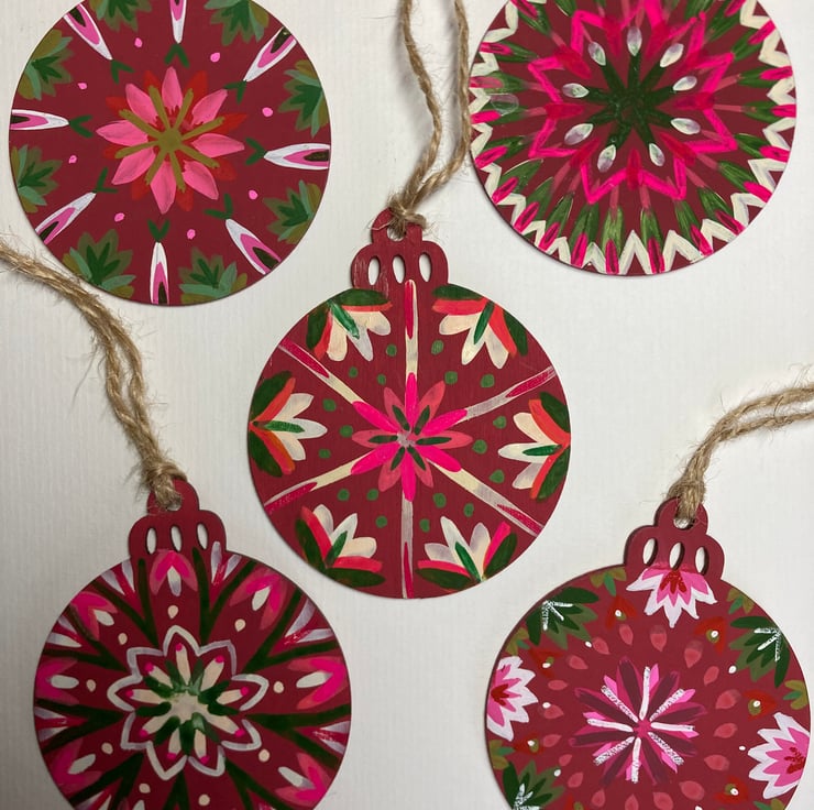 I have always loved folk art and its motifs. I love the symmetry and pattern, but also the charm of hand painted art. I paint the patterns from my imagination, and they evolve as I continue painting. These wooden baubles are painted in pinks, reds and greens which coordinate beautifully with all things Christmassy.