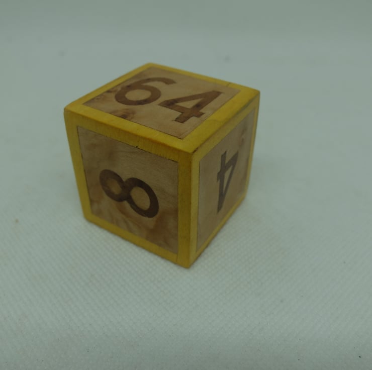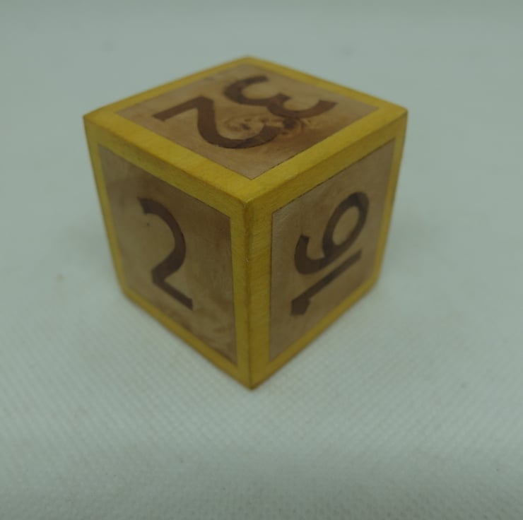 This cube has a lovely fruitwood background, walnut numbers and dyed yellow borders