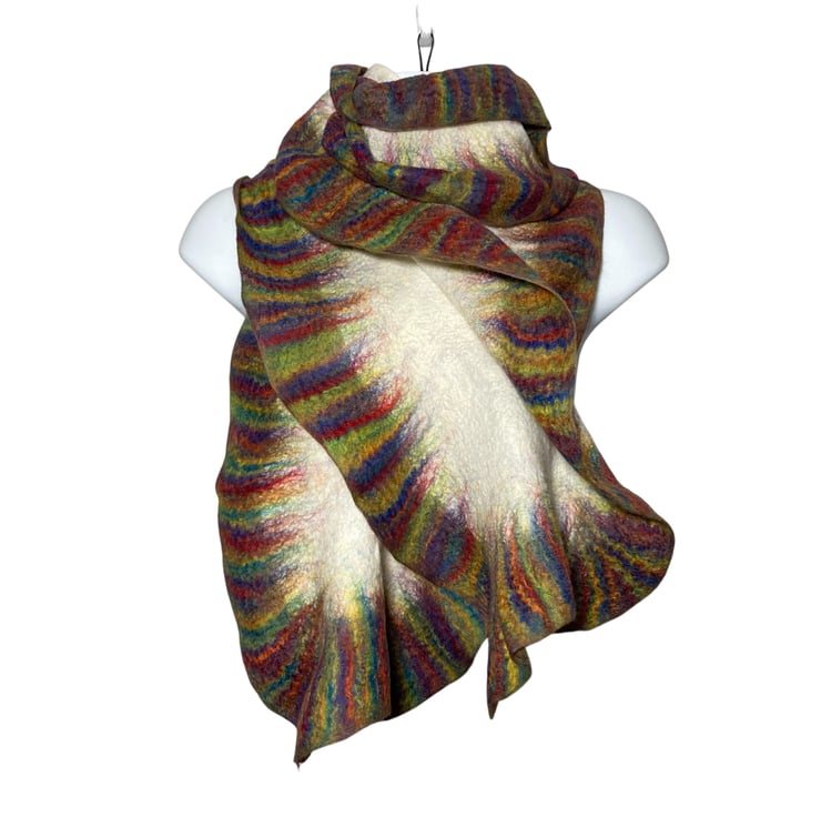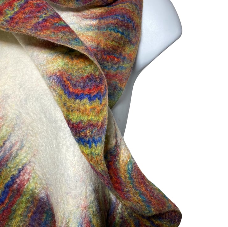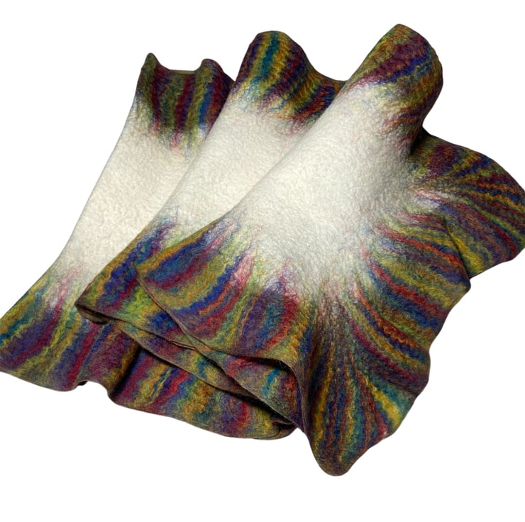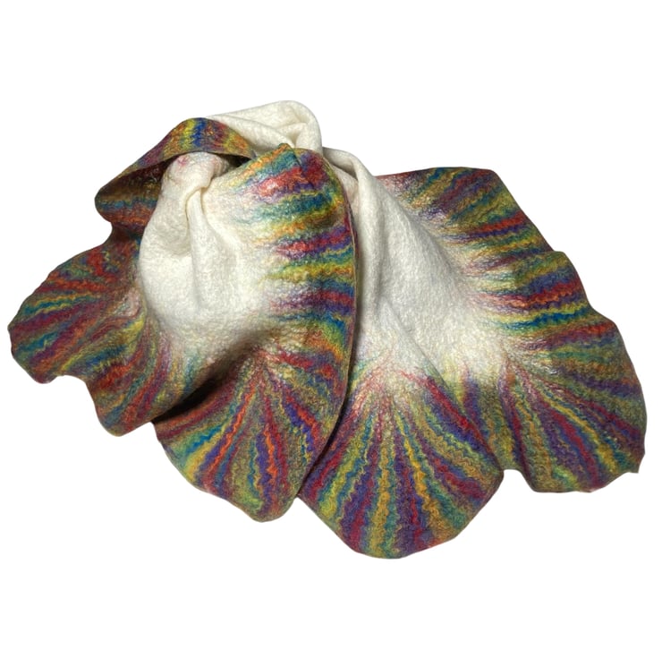 This is a striking scarf that has been made using soft, natural white (unbleached) merino wool fibres with a border of bright rainbow colours which has a pretty ruffled edge.