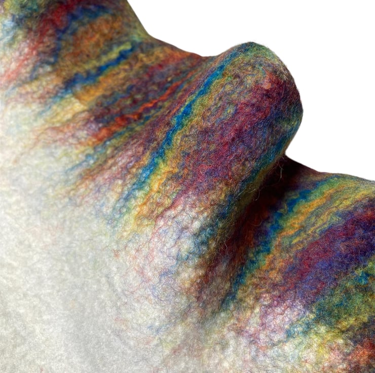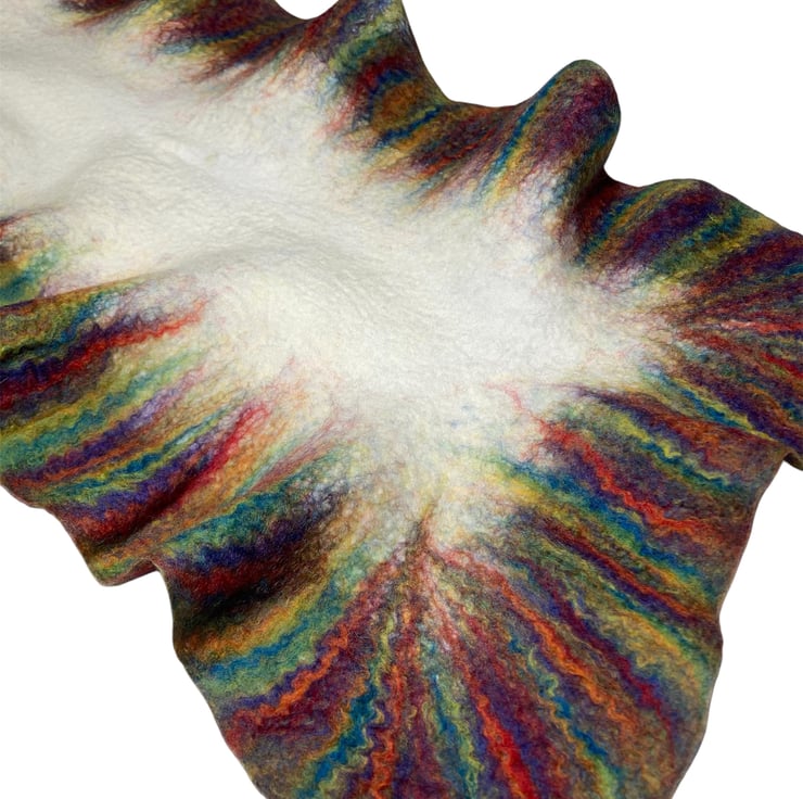 The central white band has been nuno felted onto both sides of a piece of silk chiffon, a process whereby the fine layers of woollen fibres bind to the silk allowing the scarf to remain lightweight whilst the silk chiffon gives strength to the resulting fabric. The border, made using of a rainbow blend of merino wool fibres has been added around the edge with a ruffled effect created by the arrangement of the fibres and their manipulation during the felting process.