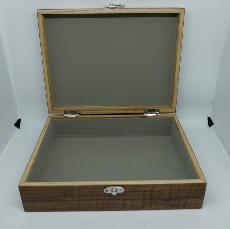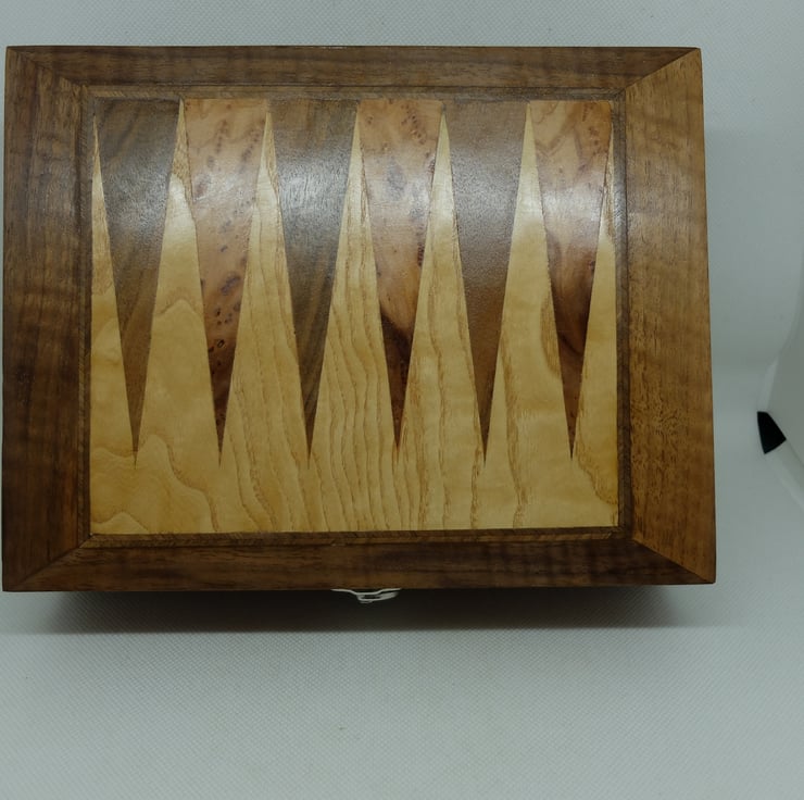Hand veneered lidded box with a Backgammon themed design to the lid in beautiful real wood veneers.