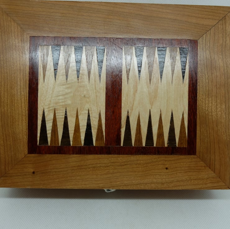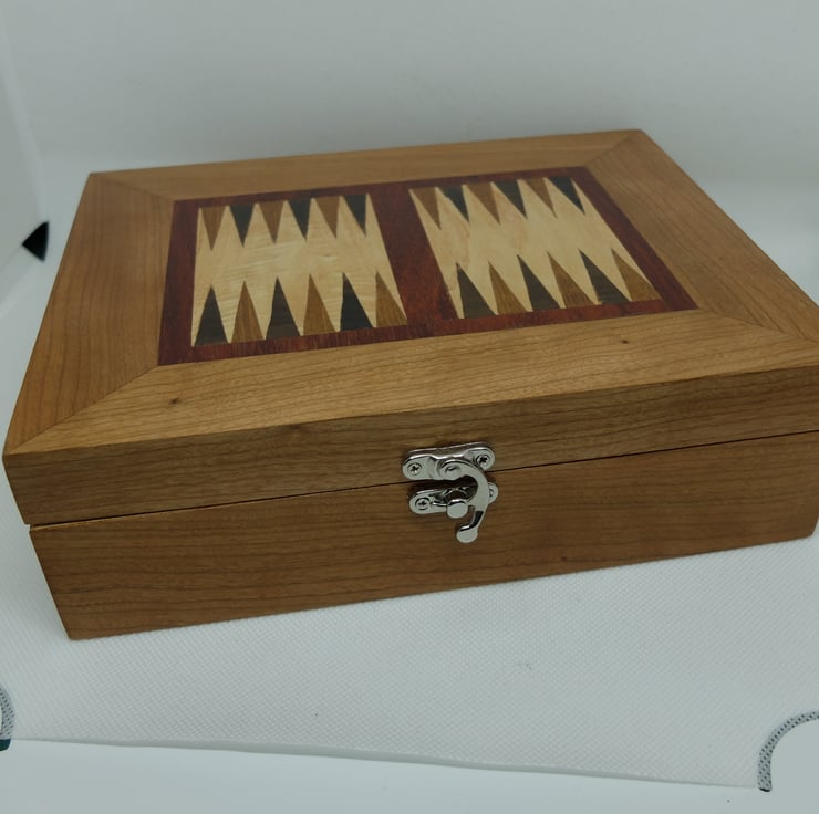 Hand veneered lidded box with a Backgammon themed design to the lid in beautiful real wood veneers.