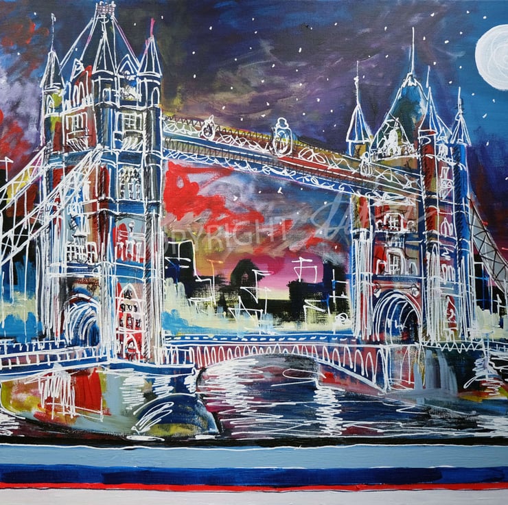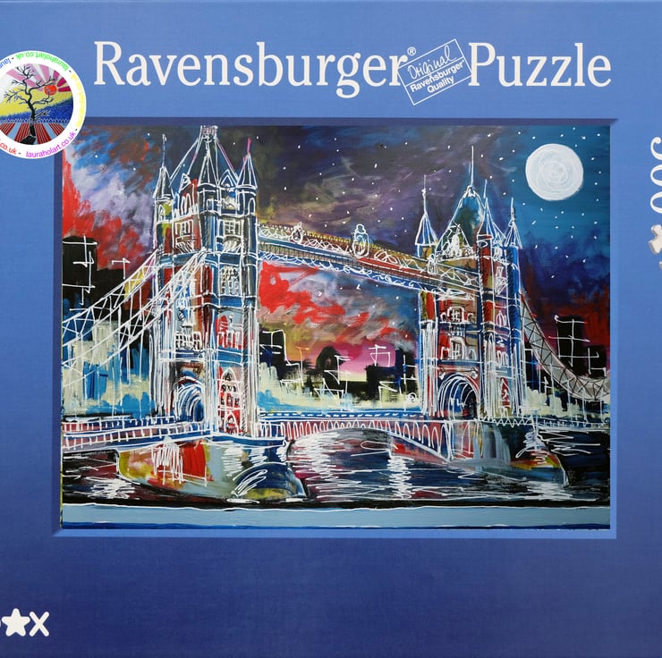 An artistic rendering of Tower Bridge in London made into a high quality jigsaw puzzle by Ravensburger - Europe's leading Jigsaw specialist.