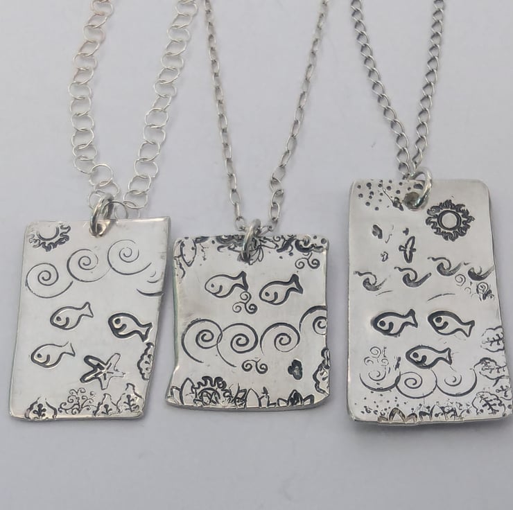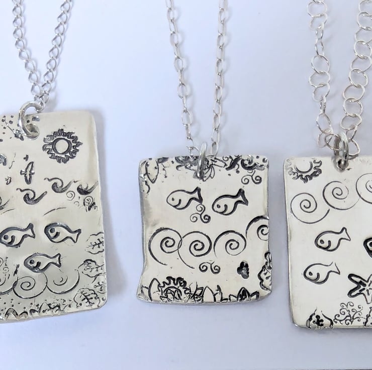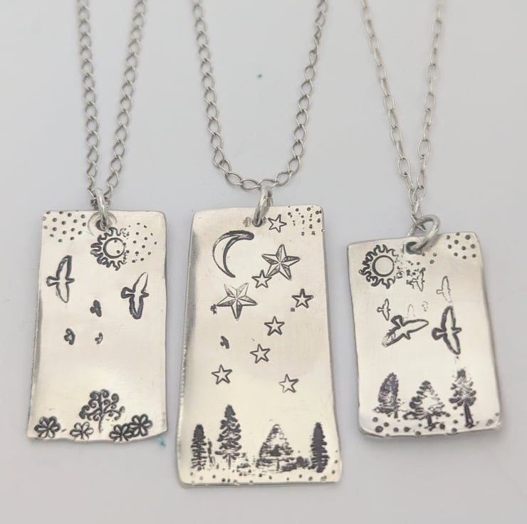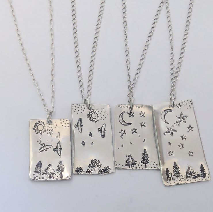 These pendants are created from sterling silver and are hand-stamped. There are seven different pictures, each unique