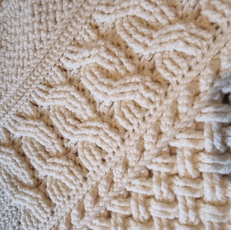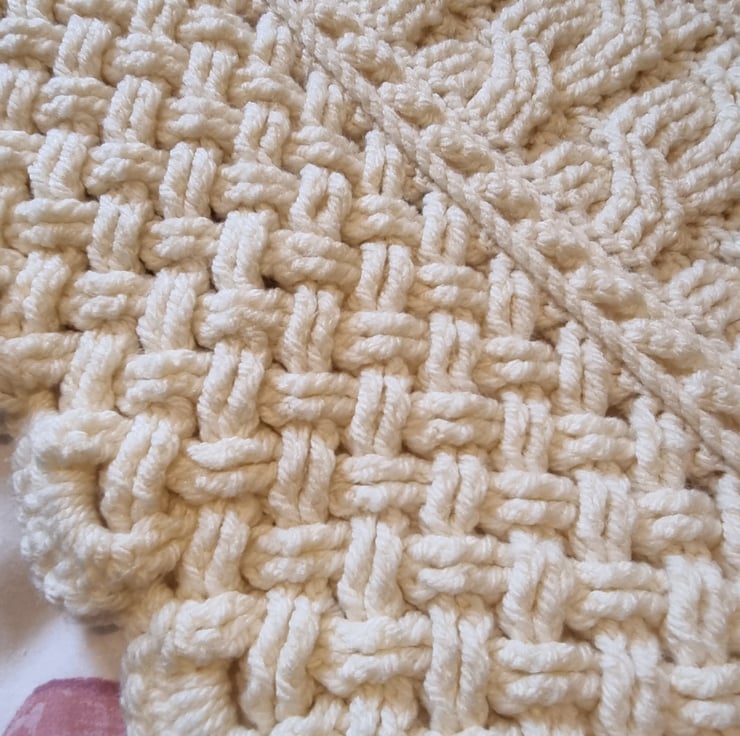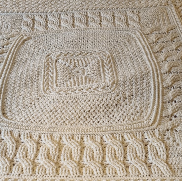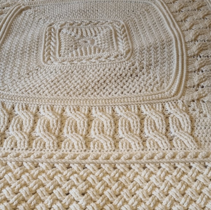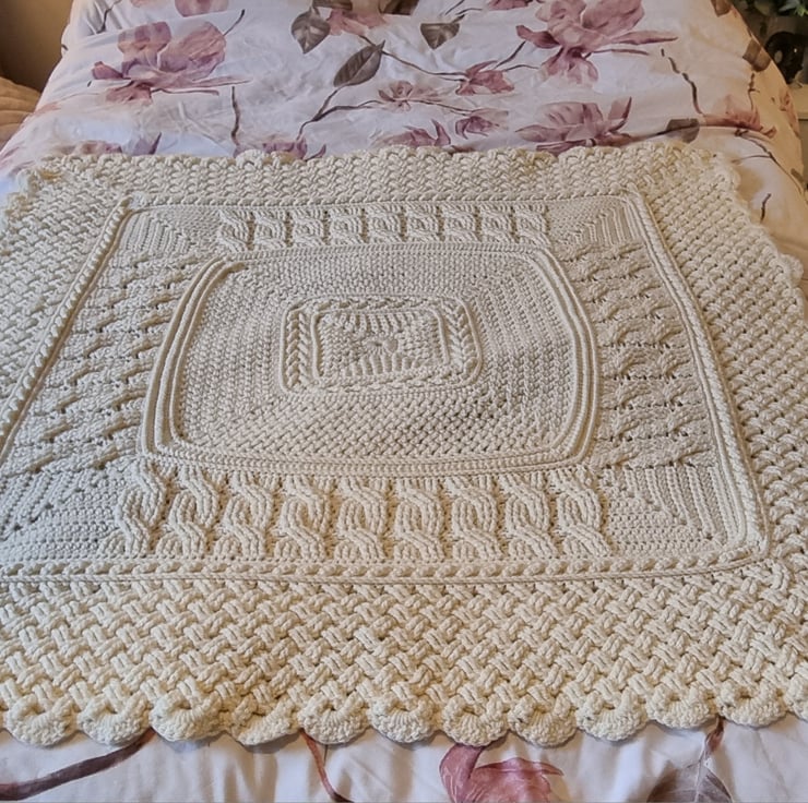 Gorgeous cream/white crochet throw/baby blanket in a celtic style. Measures approx. 105cm x 110cm and made using premium acrylic yarn which can be put in the washing machine and dryer.