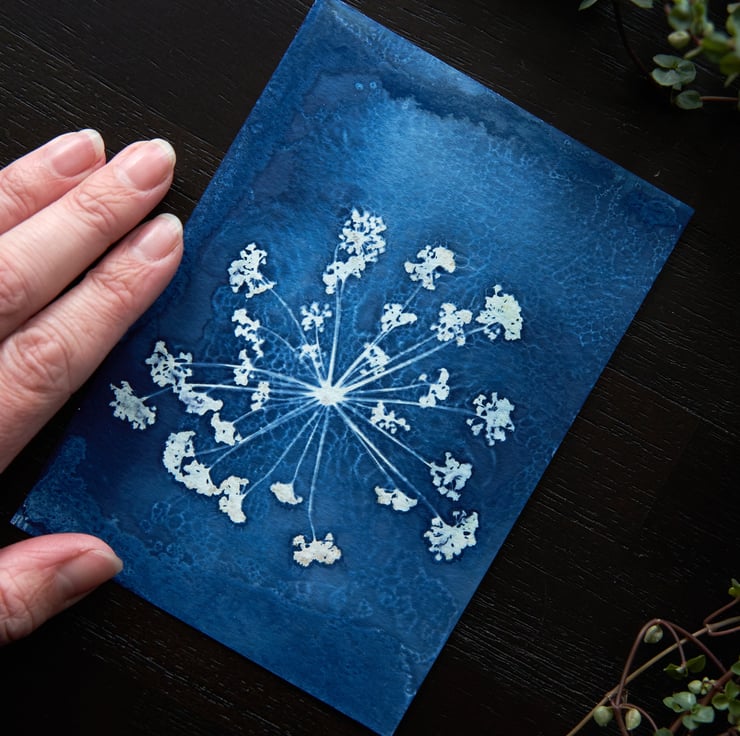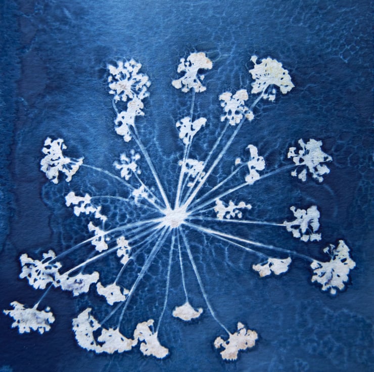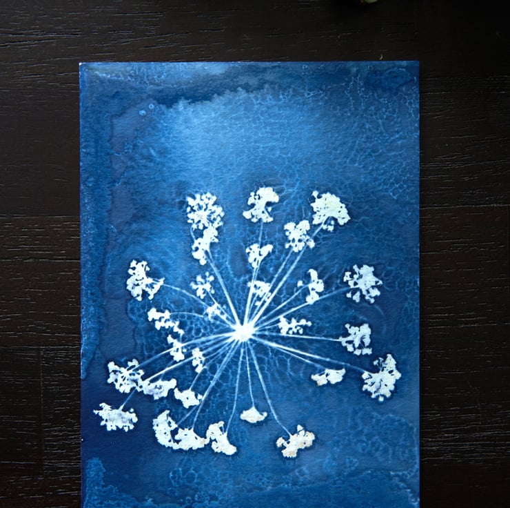 I absolutely love the effects wet cyanotype can produce and it is captured beautifully in this print which features a beautiful fennel flower that looks a little bit like fireworks! I used wet cyanotype mix, vinegar and bubbles to create the textured effect for the background, with the fennel flower laid over the top to capture its detail.
