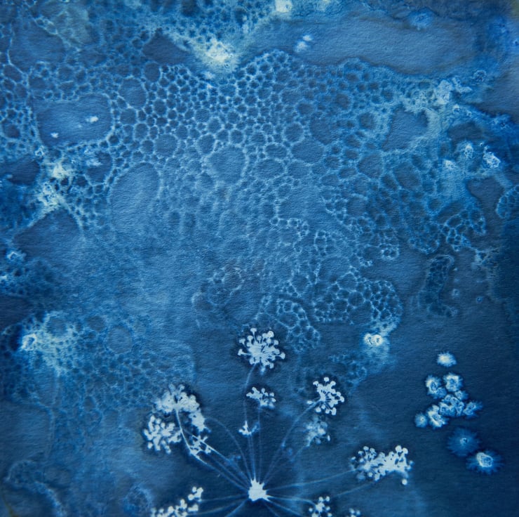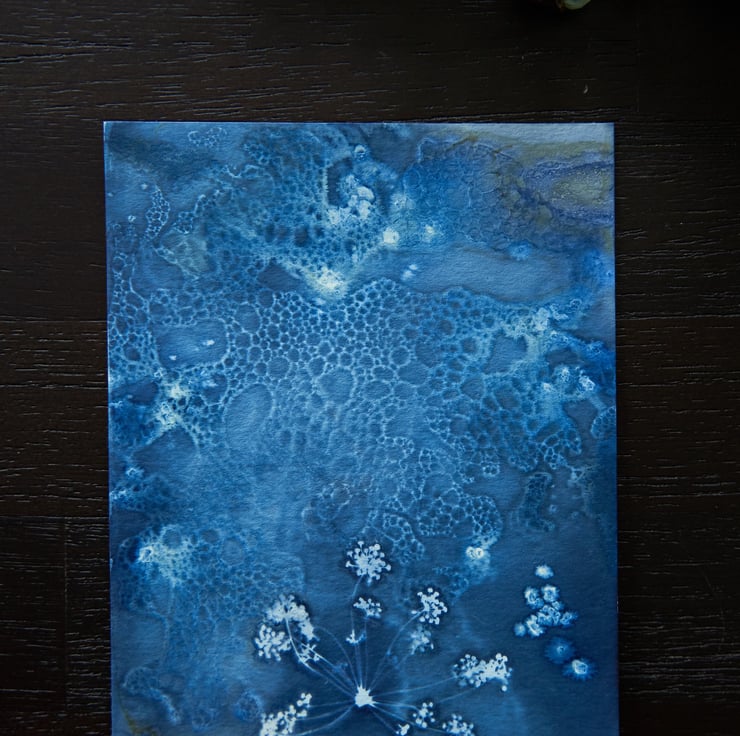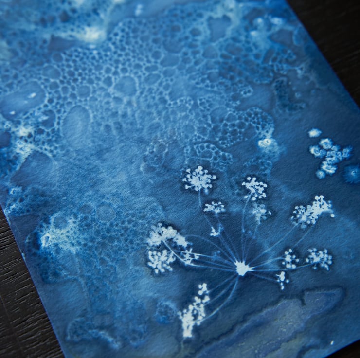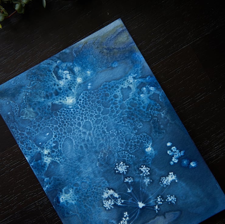 I absolutely love the effects wet cyanotype can produce and it is captured beautifully in this print which features a beautiful fennel flower that looks a little bit like fireworks! I used wet cyanotype mix, vinegar and bubbles to create the textured effect for the background, with the fennel flower laid over the top to capture its detail.