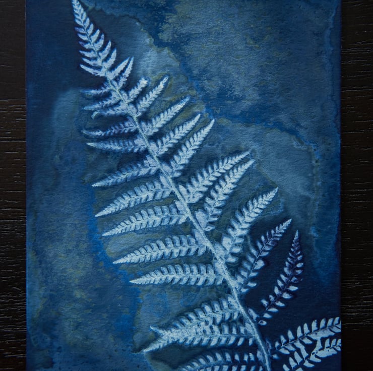 I absolutely love the effects wet cyanotype can produce and it is captured beautifully in this print which features a stunning fern which I believe captures the little details of these leaves perfectly. I used wet cyanotype mix, vinegar and bubbles to create the textured effect for the background, with the fern leaf laid over the top to capture its detail.